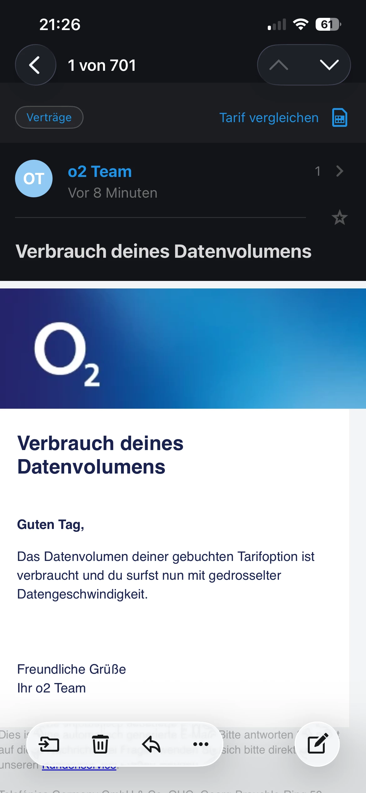 Ich bekomme seit ein paar Monaten E-Mails von o2, dass mein Datenvolumen zu 80 % verbraucht wäre. Laut der o2 App ist dies aber bei weitem nicht der Fall. Außerdem kommen die E-Mails immer kurz nach Beginn des neuen Vertragsmonats.