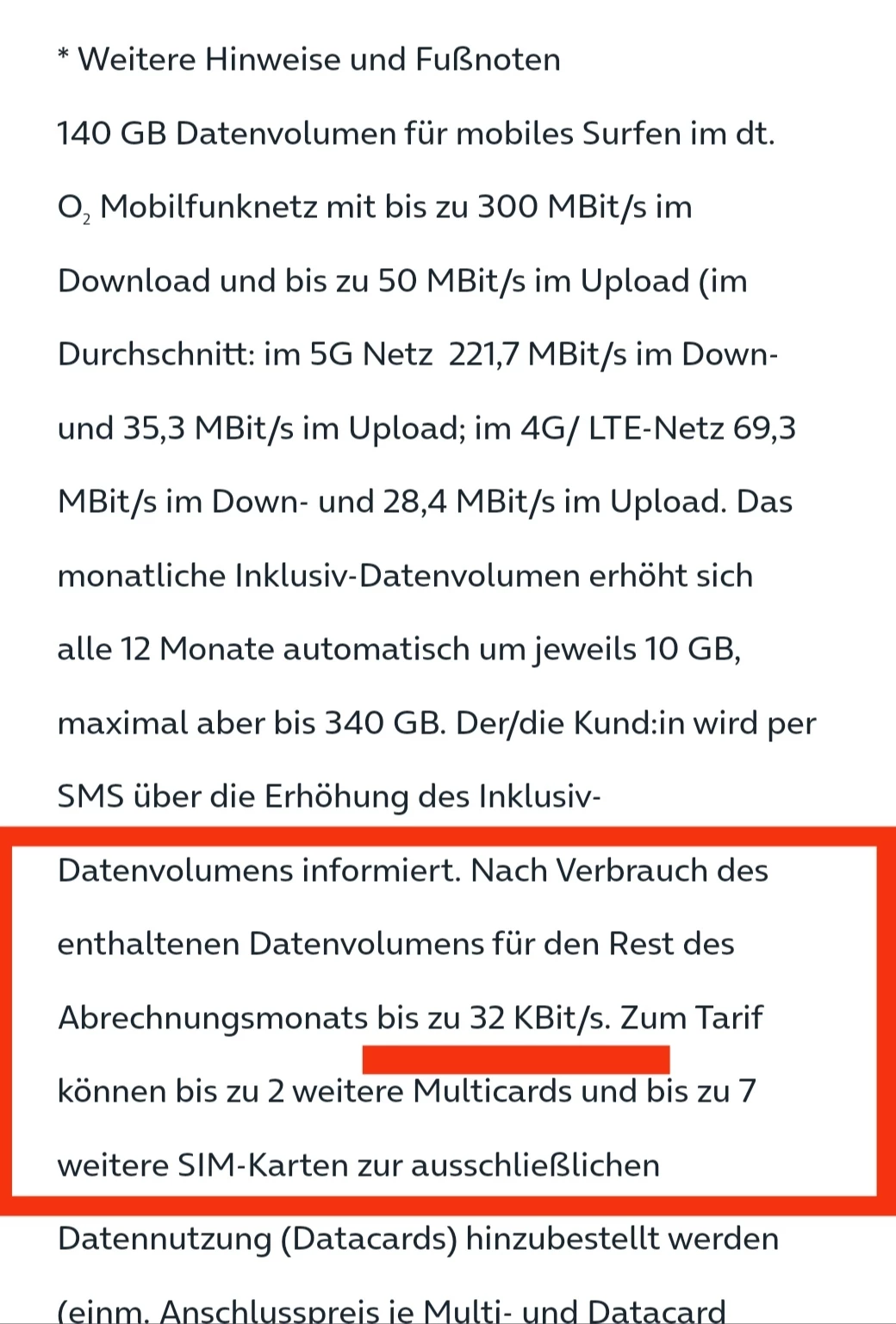 Da steht nix von Drosselung auf 32b/s. Das bekommt man erst mit, wenn es soweit ist.