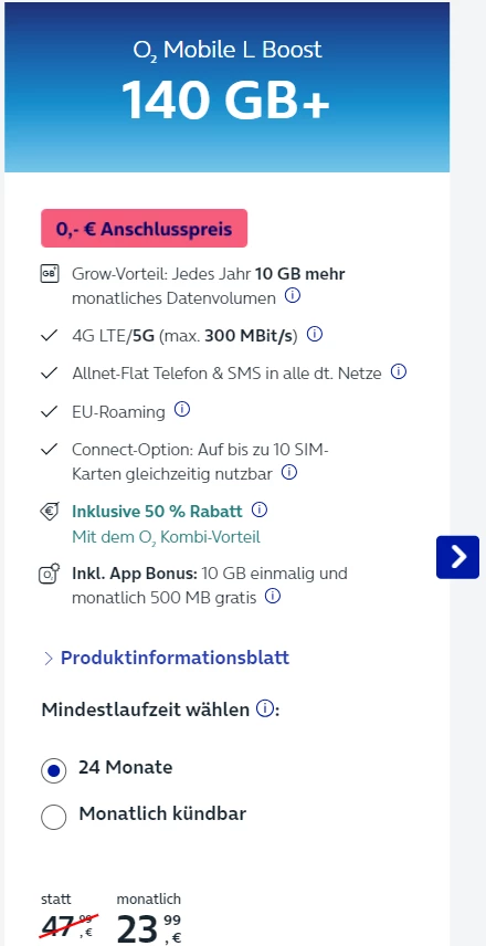 Und ja, die Weitersurfgarantie wird nicht mehr angeboten. Dafür beinhalten aber unsere neuen Tarife noch mehr Datenvolumen. Zum Beispiel o2 Mobile L Boost mit 140 GB (früher o2 Free L Boost mit 120 GB).
