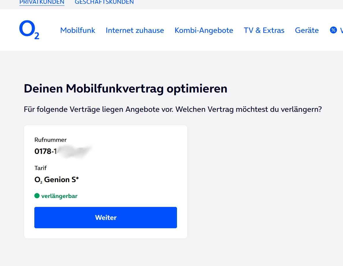 leider habe ich den Eindruck, dass es bei der Online-Vertragsverlängerung ein technisches Problem gibt. Als langjähriger Kunde seit der Zeit von Viag Interkom (damalige Rufnummer 0179-xxxx121), die ich damals am  1. Oktober 1998 nach fast vier Stunden Wartezeit auf der Zeil in Frankfurt erhalten habe, wollte ich mir lediglich die angebotenen Optionen ansehen.