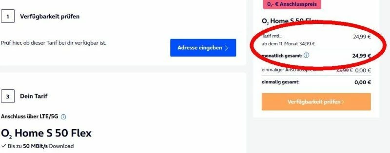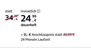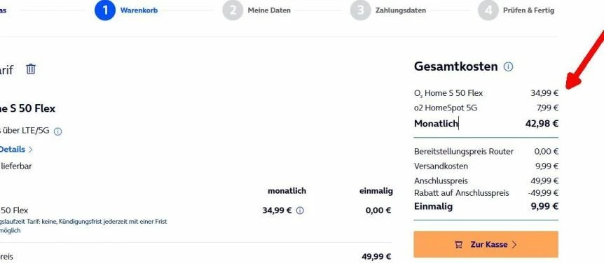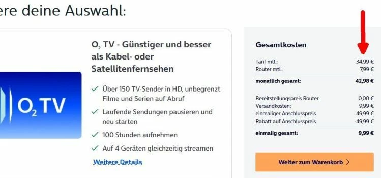 Monatlich kündbar //  “100 € Rabatt. Du sparst 10x10 €”  // unten Monatlich 24,99 € / Ab dem 11. Monat 34,99 € an. Wenn ich es auswähle, dann erfolgt die “Prüfung der Verfügbarkeit”. Nach der Prüfung wird mir ein Popup gezeigt, dass mir auch in dieser Übersicht genau das gleiche zeigt. Wenn ich dann “Weiter mit  Auswahl” anklicke ist auch noch alles “OK”. Wähle ich dann den Router aus, zeigt es mir in der “Erweitere deine Auswahl” bereits an dass es nun 35,99 € von Anfang an kostet. Plus die 7,99 € für den Router. Monatlich gesamt: 42,98 €.  und auch bei der letzten Seite bevor man zur Kasse geht. Was ist hier los ?
