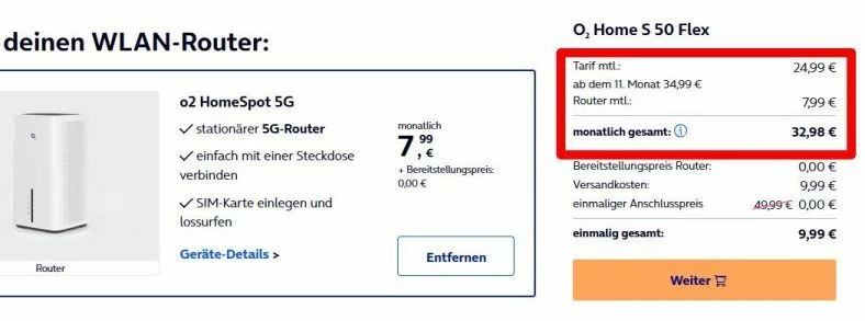 Wenn der Router nachträglich bestellt wird, dann kostet es 49,99 1 x Gebühr + 9,99 Porto.
