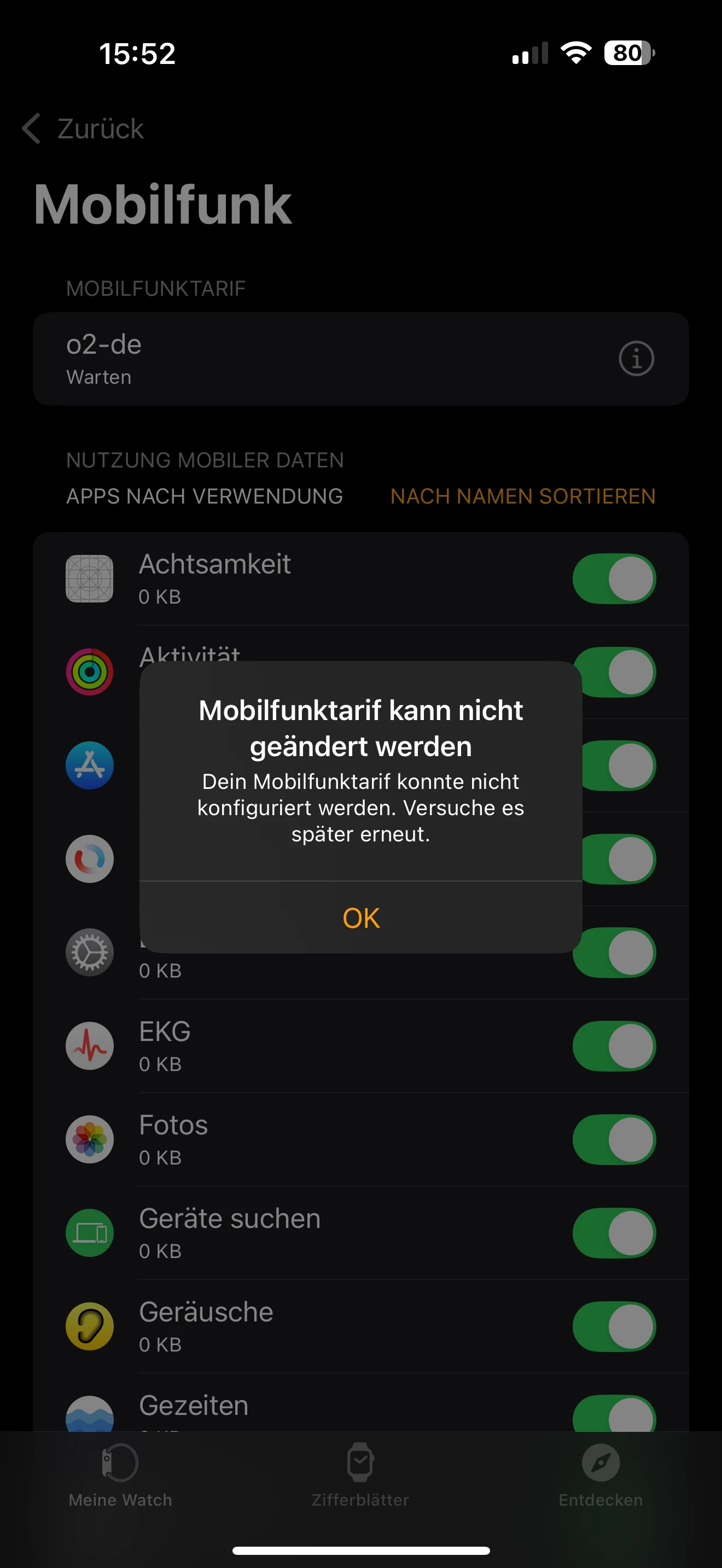 Ich habe jetzt zwar Netz auf dem iPhone, aber meine Apple Watch kann nach wie vor nicht konfiguriert werden – weil ihre eSIM dafür offensichtlich „verbraucht“ wurde.