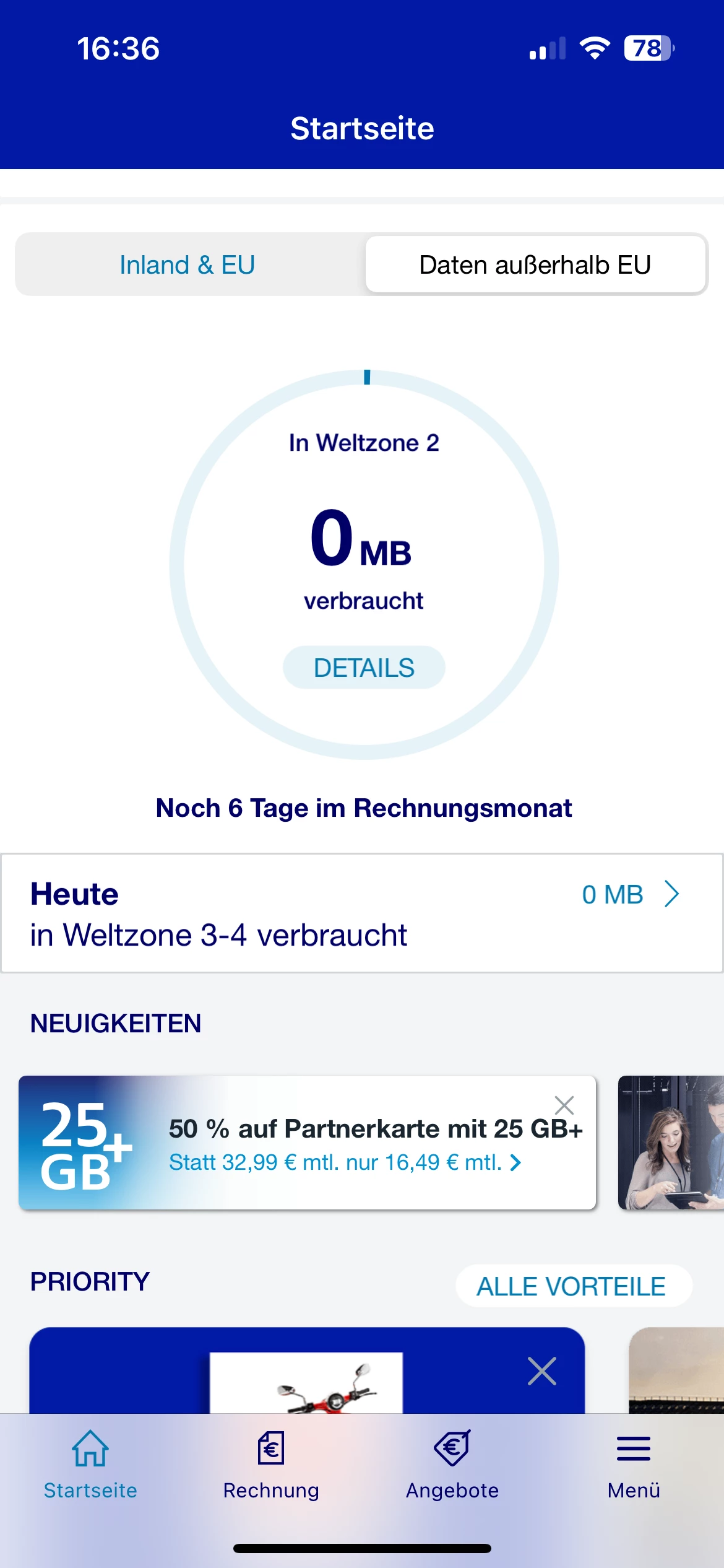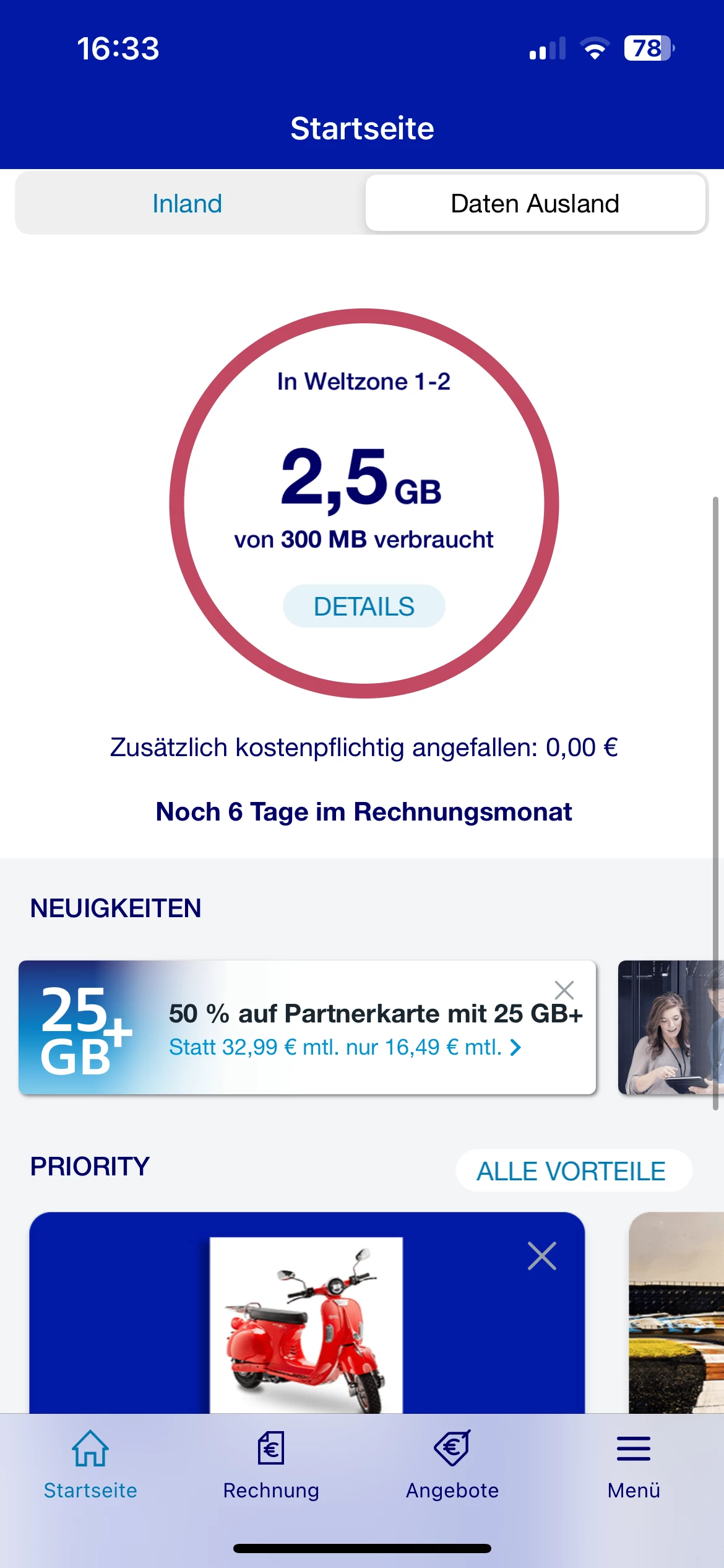 Danke für dein Feedback, leider funktionierte es auch nicht, obwohl ich vor dem Auslandsaufenthalt die monatsweise angeschlossen hatte. Früher hat es auch immer funktioniert. Aber es war so, wie in der App dargestellt. Auch bei meiner Frau brauchten wir zum Ende 5GB mehr und es hatte sofort funktioniert.