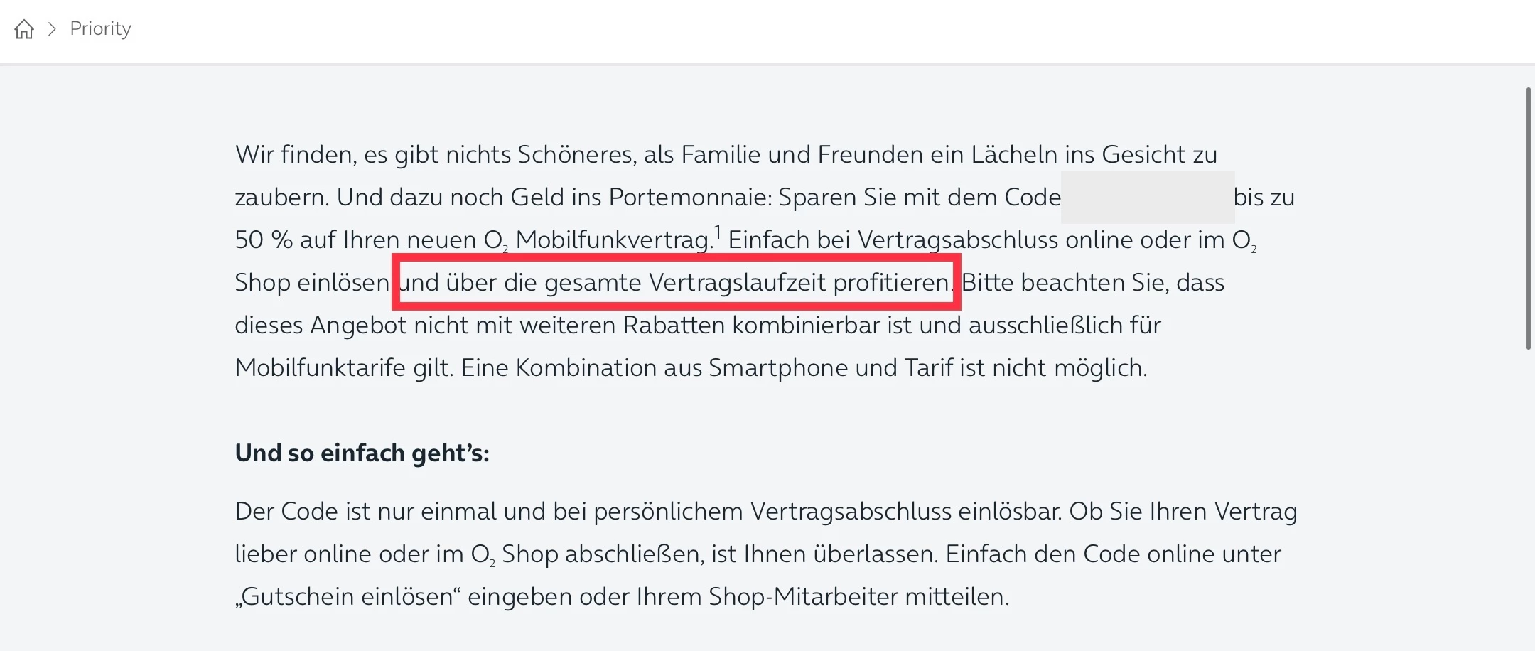 Ich weiß nicht, ob ein "O2 Discounts" Exclusiv Vorteil ein Priority/Family & Friends Gutschein ist, der immer weiter läuft ist, da ich den Vertrag 2021 telefonisch abgeschlossen hatte und mir der 50% Rabatt so angeboten wurde.
