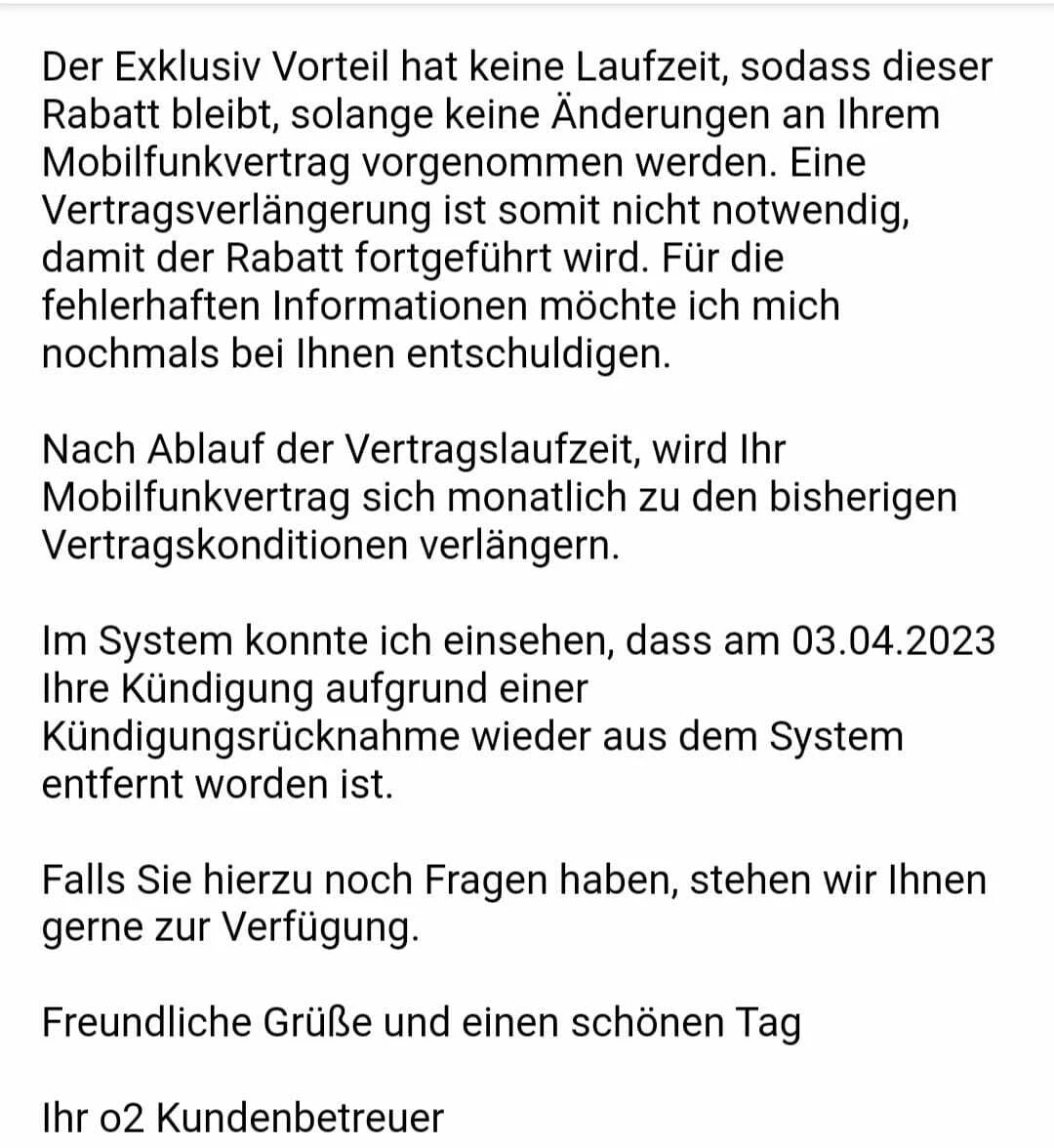 Ich hatte am 27.03.2023 2 Telefonate mit O2, um mich wegen einer Vertragsverlängerung zu informieren, da laut App eine Vertragsverlängerung angezeigt wurde. Mein aktueller Vertrag hat einen Exclusiv Vorteil in der App angezeigt.