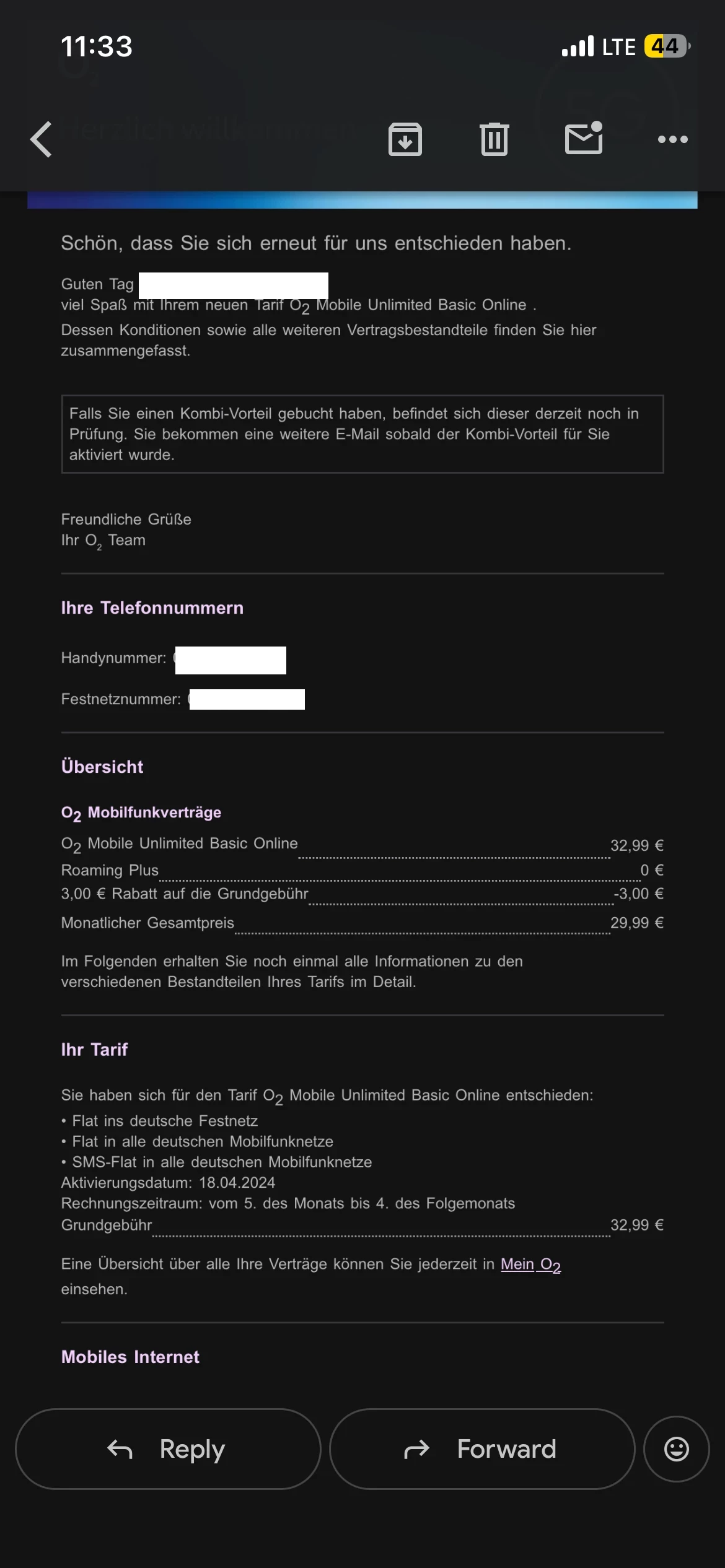 Nein, im email habe ich nur Bestätigung bekommen das ich für O2 unlimited on Demand entschieden haben aber das war nicht was er gesagt hatte