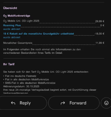 Ich habe zwar eine E-Mail zum Vertrag erhalten, aber der Mitarbeiter am Telefon hat mir damals ausdrücklich gesagt, dass mein Vertrag gleich bleibt und ich nur einen Rabatt von 18 € bekomme.