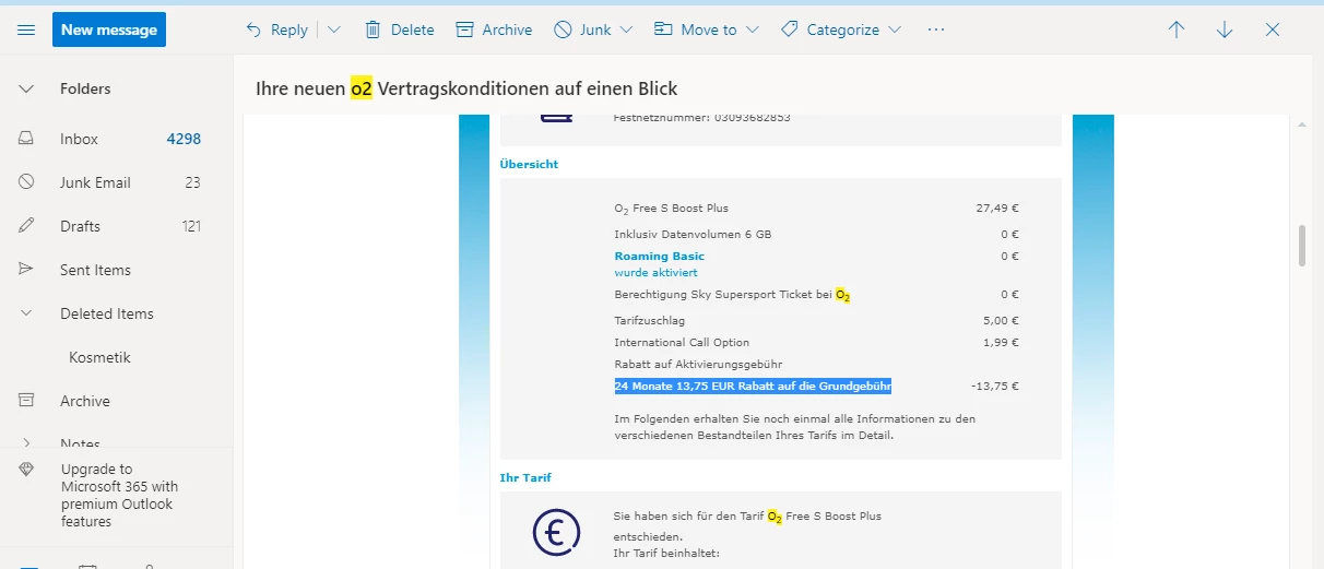 Laut dem Vertrag sollte ich 24 Monate lang einen Rabatt in Höhe von 13,75€ auf Grundgebühr das bei 27,49€ liegt, bekommen. Dieser Rabatt wird mir aber seit der Verlängerung nicht berechnet.
