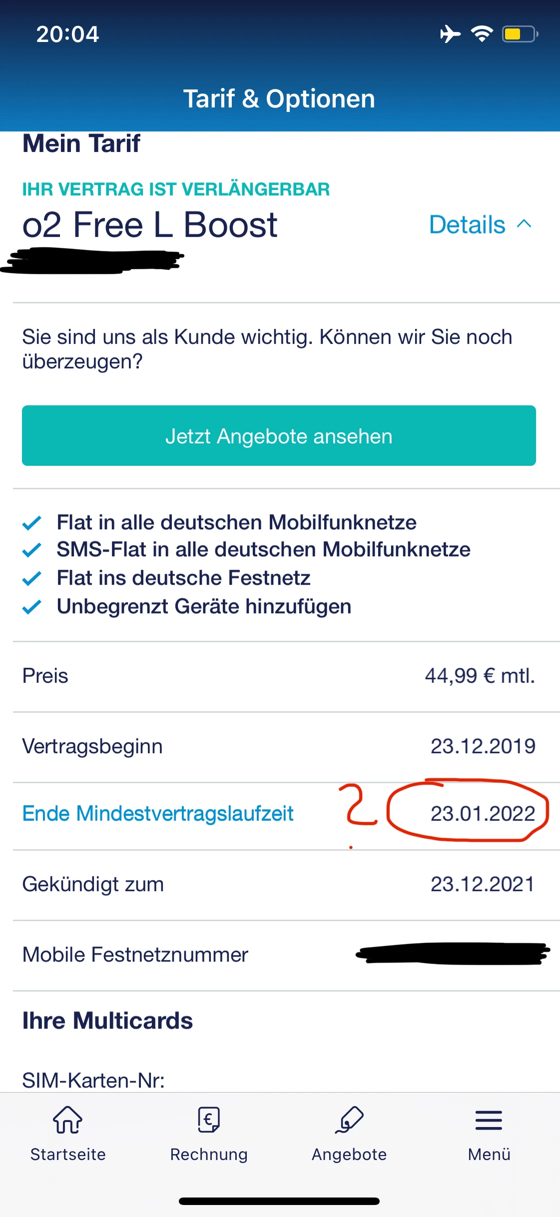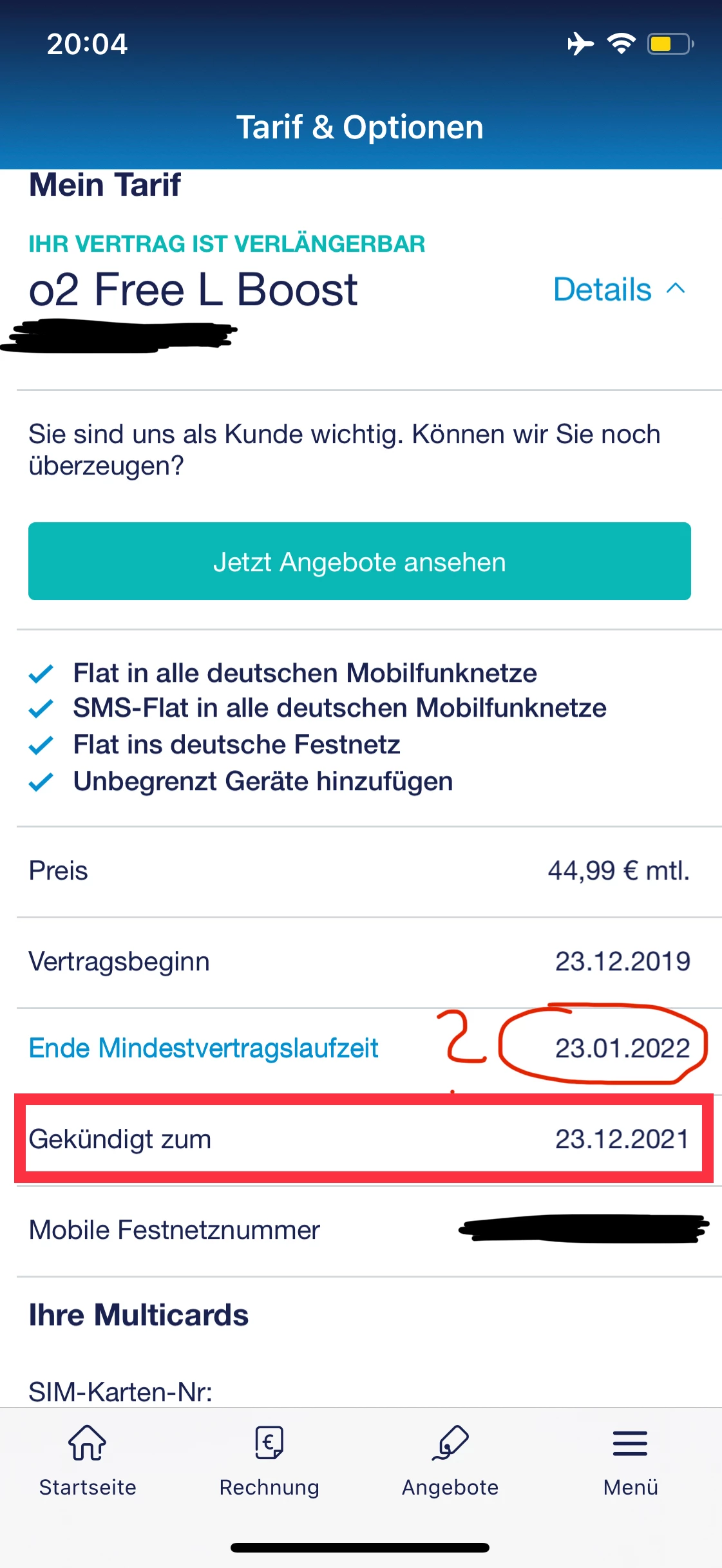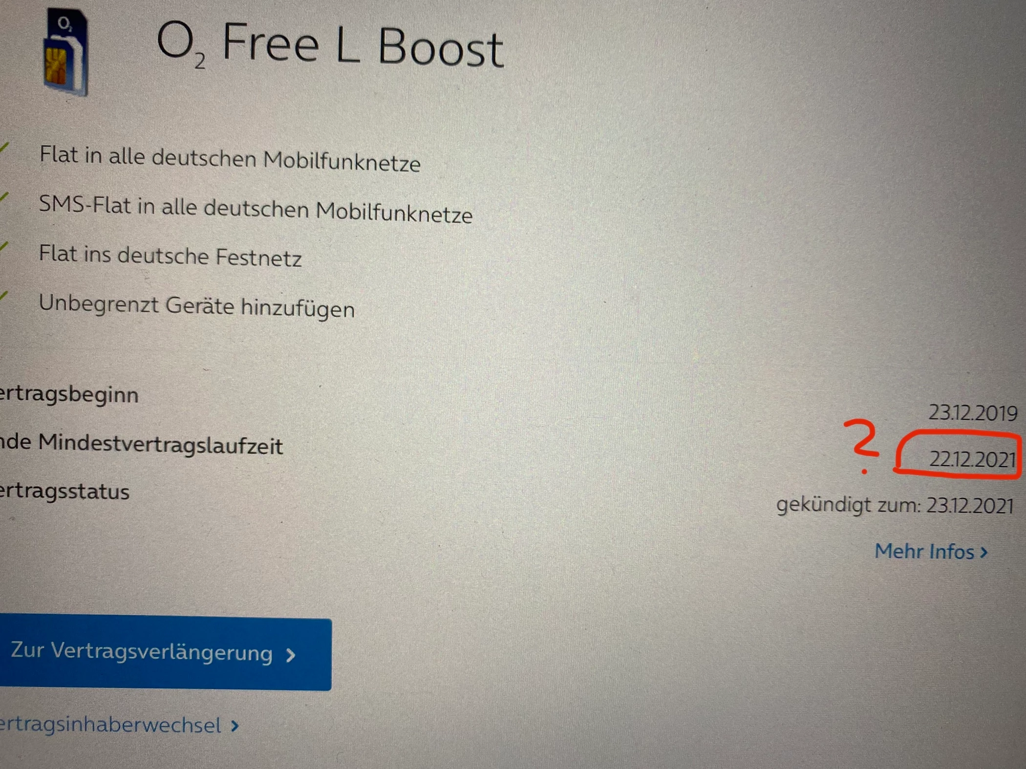 Hallo, ich habe meinen Mobilfunkvertrag zum 23.12.2021 gekündigt (siehe Foto). Nun habe ich heute in der App gesehen, dass das Ende der Mindestvertragslaufzeit auf den 23.01.2022 fällt (Screenshot). Woher kommt plötzlich der extra Monat?
