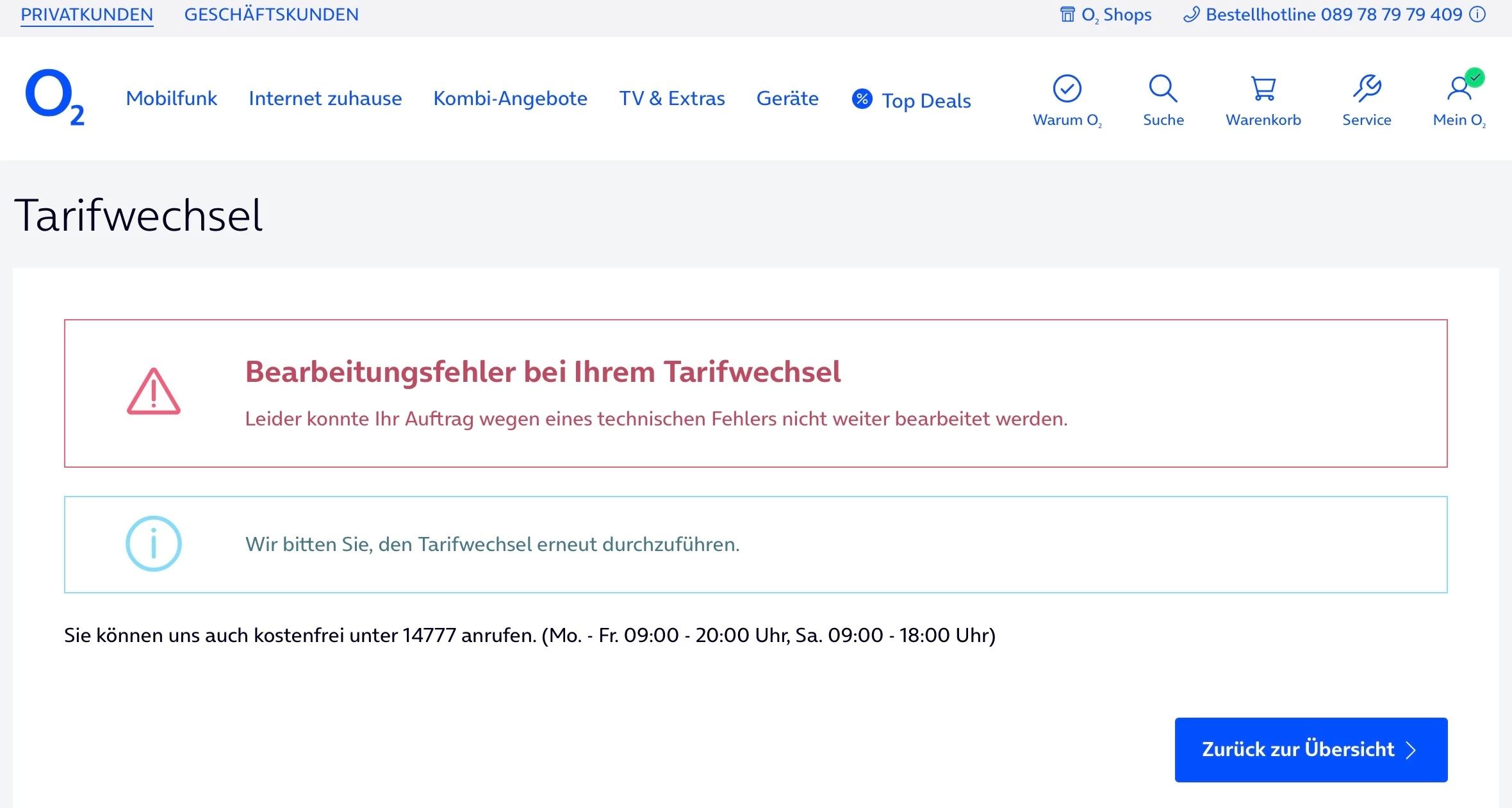 FAQ zu „Bearbeitungsfehler bei Ihrem Tarifwechsel / Ihrer Vertragsverlängerung“ im Mein O₂ Bereich