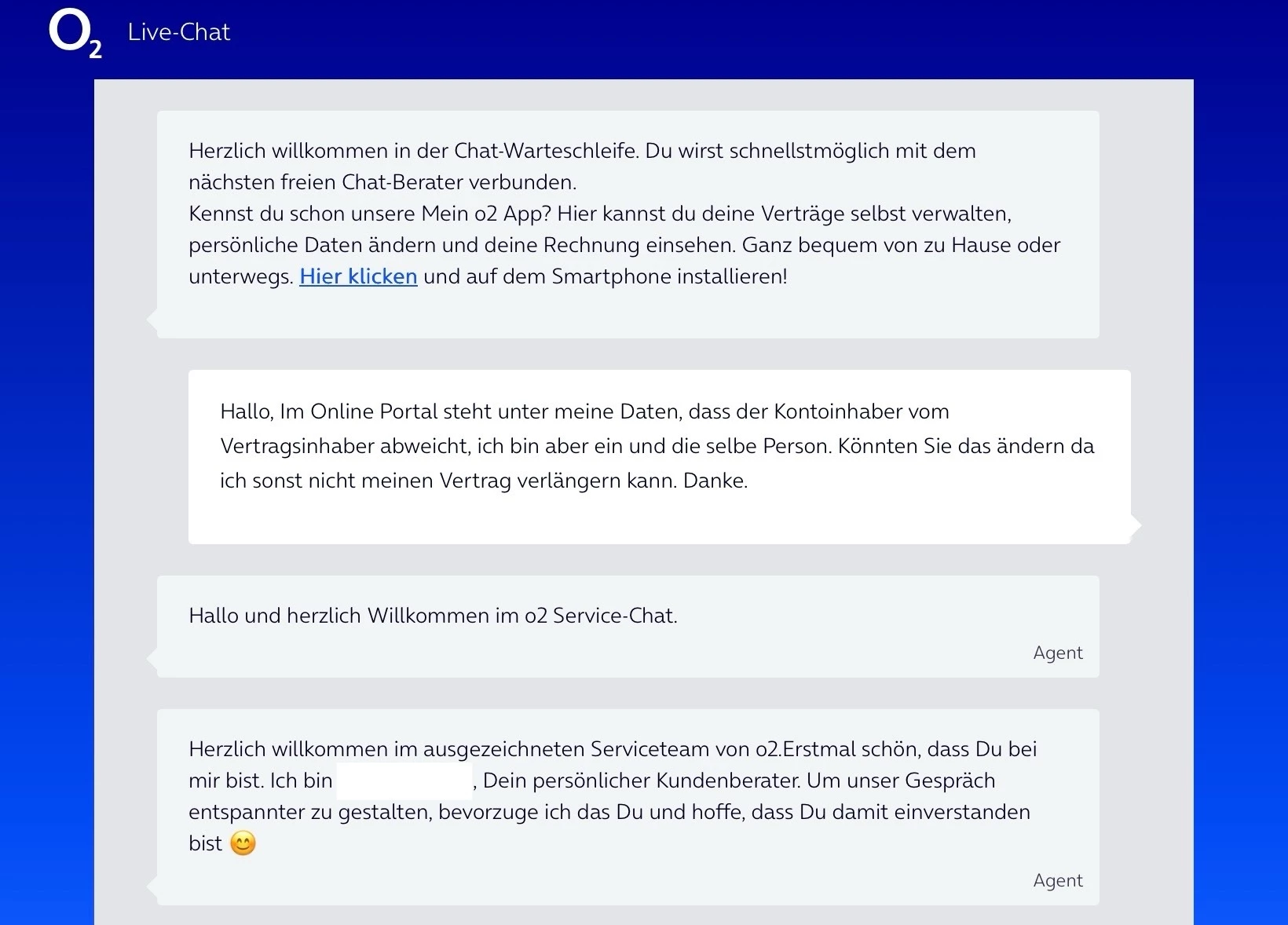 Kurz zur Erklärung, wenn der Kontoinhaber bewusst vom Vertragsinhaber abweicht, weil zB. ein Familienmitglied die monatlichen Rechnungen bezahlt, könnt ihr in solch einen Fall den Tarifwechsel/die Vertragsverlängerung nur über die Kundenbetreuung oder einen O₂ Shop durchführen. Wenn aber der Vertragsinhaber vom Kontoinhaber nicht abweicht, habt ihr irgendwann mal diesen Vertrag von einer anderen Person übernommen, und deshalb diesen Eintrag.