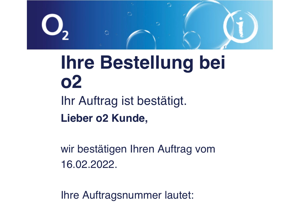 Guten Tag! Ich habe am Sonntag den 06.02.22 , online , eine Bestellung getätigt und bis zum jetzigen Zeitpunkt ausschließlich eine Eingangsbestätigung sowie die Aufforderung der Anzahlung erhalten. Die Anzahlung wurde am Montag den 07.02.22 , über den Link in der Mail , getätigt. Leider habe ich noch keinerlei Informationen, bezüglich des zugehörigen Vertrages , O2 free M , Versandbestätigung des LG TV sowie eine Auftragsbestätigung erhalten. Wann kann ich mit einer weiteren Bearbeitung , Versand der Hardware und der SIM-Karte rechnen?