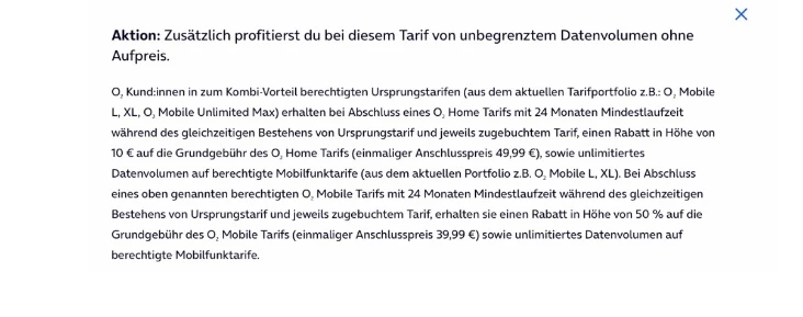 Die O2 Kombi-Vorteile gelten ab deinem 2. Tarif und für bis zu 4 O2 Mobilfunk- oder Datentarife und einen O2 Internet Zuhause-Tarif mit 24 Monaten Mindestlaufzeit.