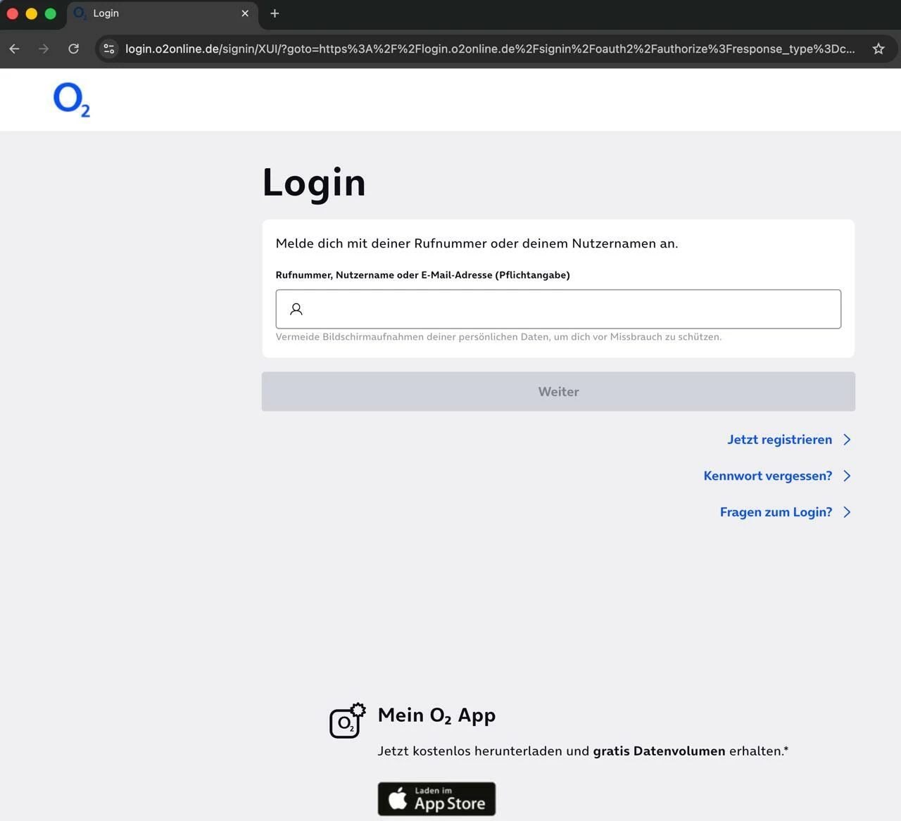 Also wollte ich mich neu registrieren, aber egal ob ich über „Jetzt registrieren“ oder über den Direktlink gehe, ich lande immer wieder auf der Seite „Registrierung als Mobilfunk-Kunde“ und soll eine Rufnummer oder Vertragsnummer eingeben. Da ich keinen eigenen Vertrag habe, komme ich an der Stelle nicht weiter – O2 bietet anscheinend keine Registrierung ohne bestehende Nummer an. Teilweise bekomme ich beim Öffnen des Registrierungs-Flows sogar einen 401 Unauthorized.