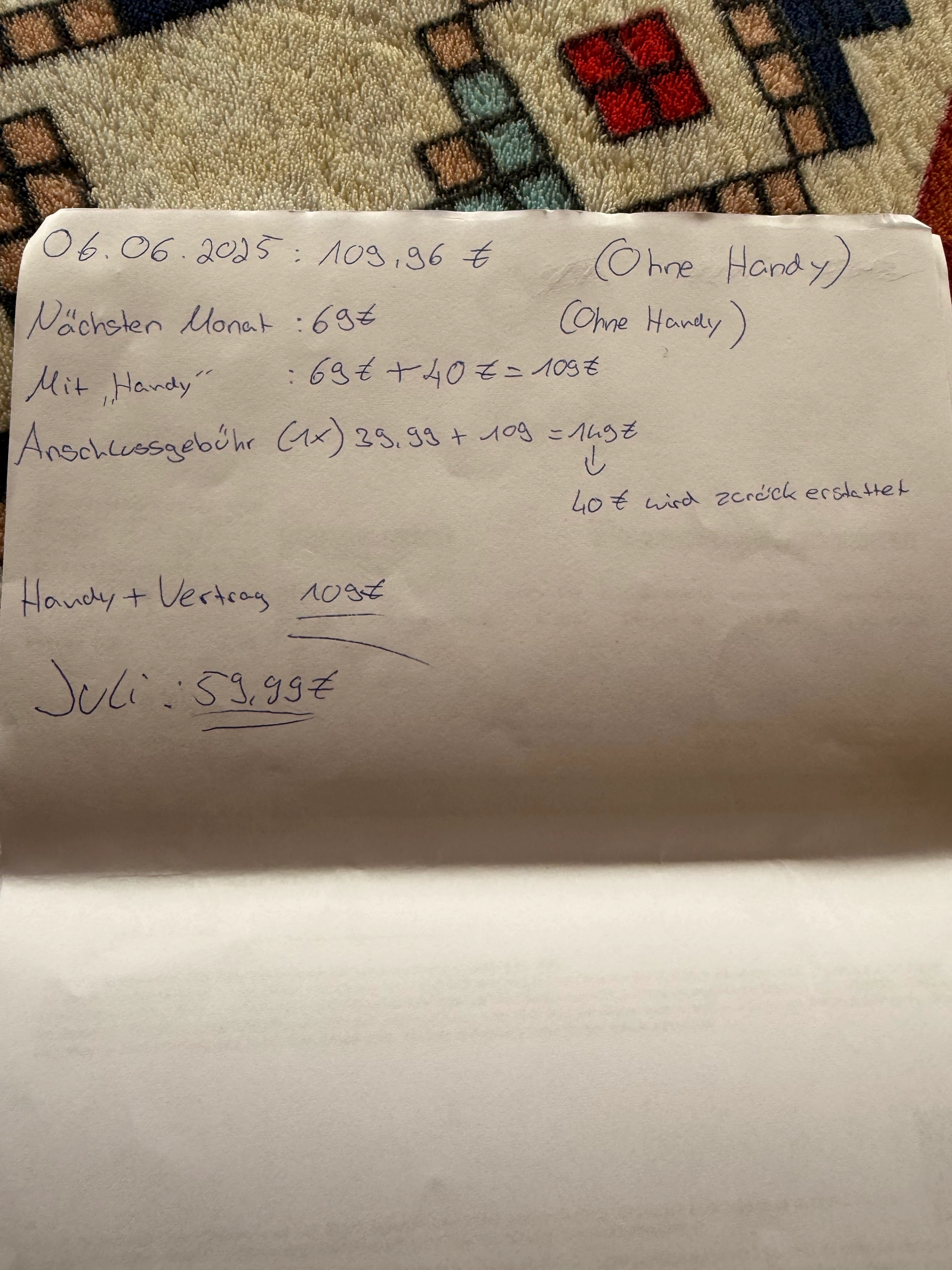 Im Juni wurden mir jedoch 109 € für den Tarif und zusätzlich 40 € für das Handy berechnet. Insgesamt also 159 €. Man sagte mir, dass mir im nächsten Monat 40 € zurückerstattet werden – bisher habe ich aber nichts erhalten.