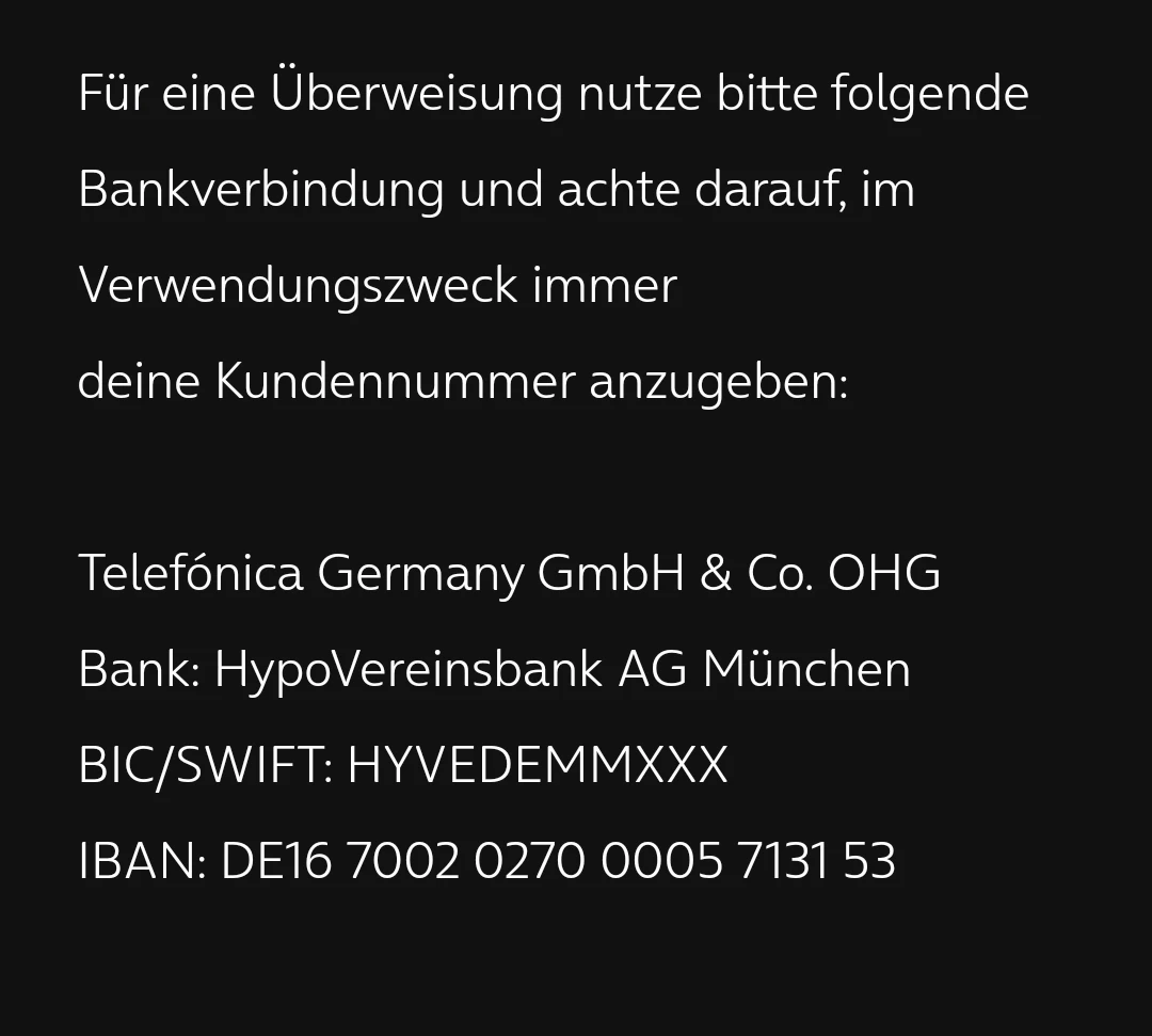 Ja Richtig ich habe diese Bank Überwiesen aber ich nicht Kundennummer mit. Weil ich muss andere Bank überweisen zahlen meine.