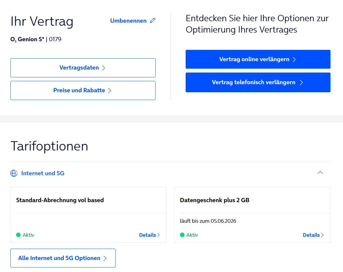 Bei Vertrag 2 steht Standard-Abrechnung vol based und rechts daneben Datengeschenk plus 1 GB. (@Mod: Könnt ihr hier nicht sehen, weil der Vertag unter einer anderen Kundennummer läuft)