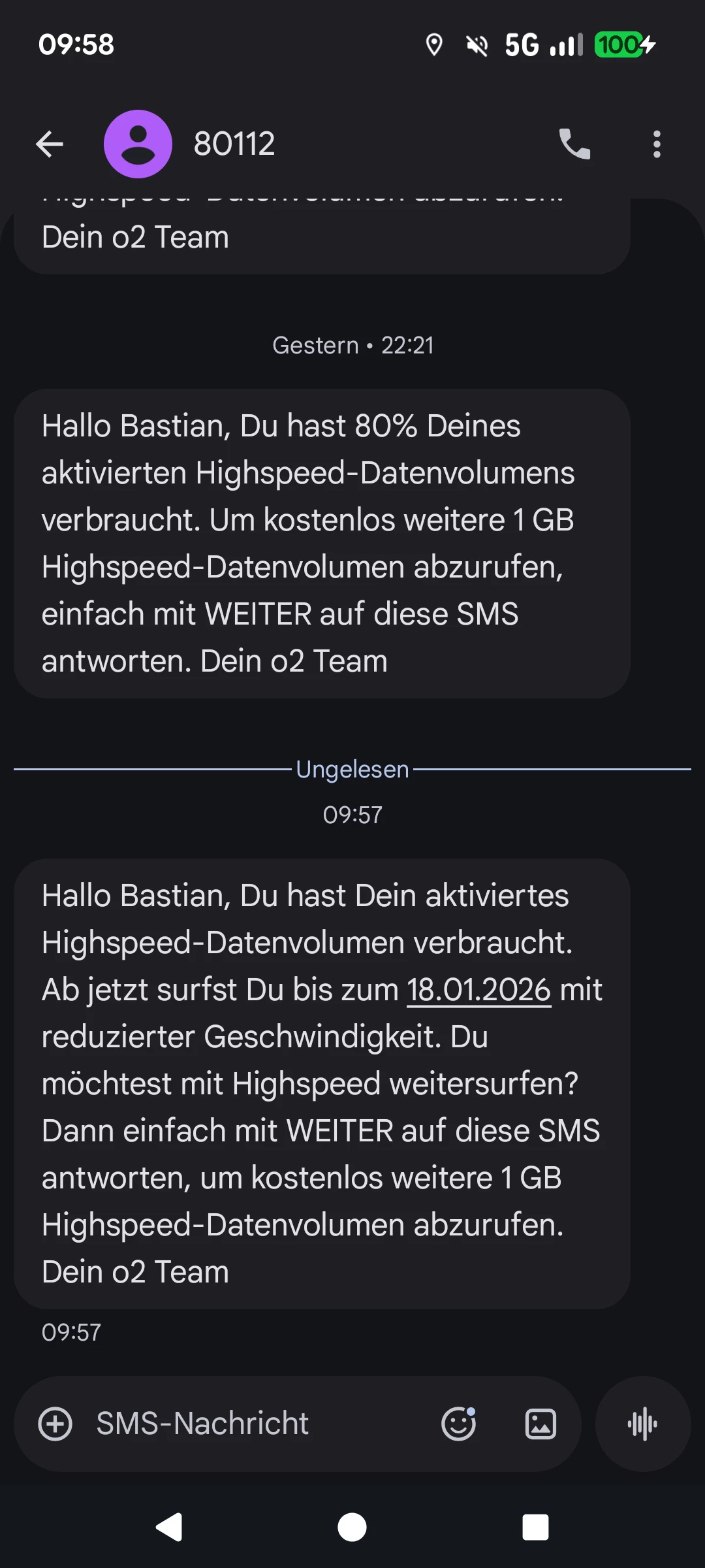 Soeben eine SMS bekommen, dass das Datenvolumen aufgebraucht ist.