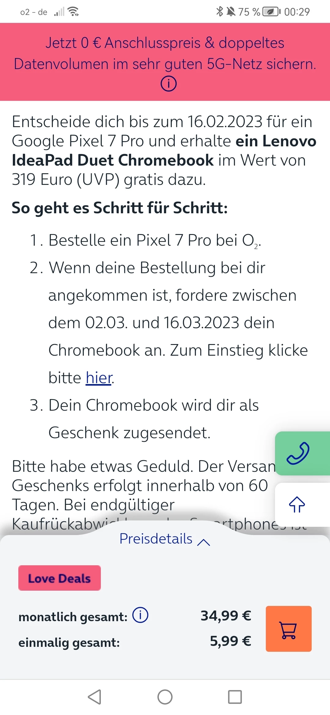 Kaufe ein Google Pixel 7 Pro bis zum 16.02.2023 bei O2 Telefónica Deutschland im Rahmen eines O2 Mobilfunk Neuvertrag oder einer O2 Mobilfunk Vertragsverlängerung und erhalte als einer oder eine der ersten 2.000 Teilnehmer die Möglichkeit das Lenovo IdeaPad Duet Chromebook als Geschenk zu beantragen.*