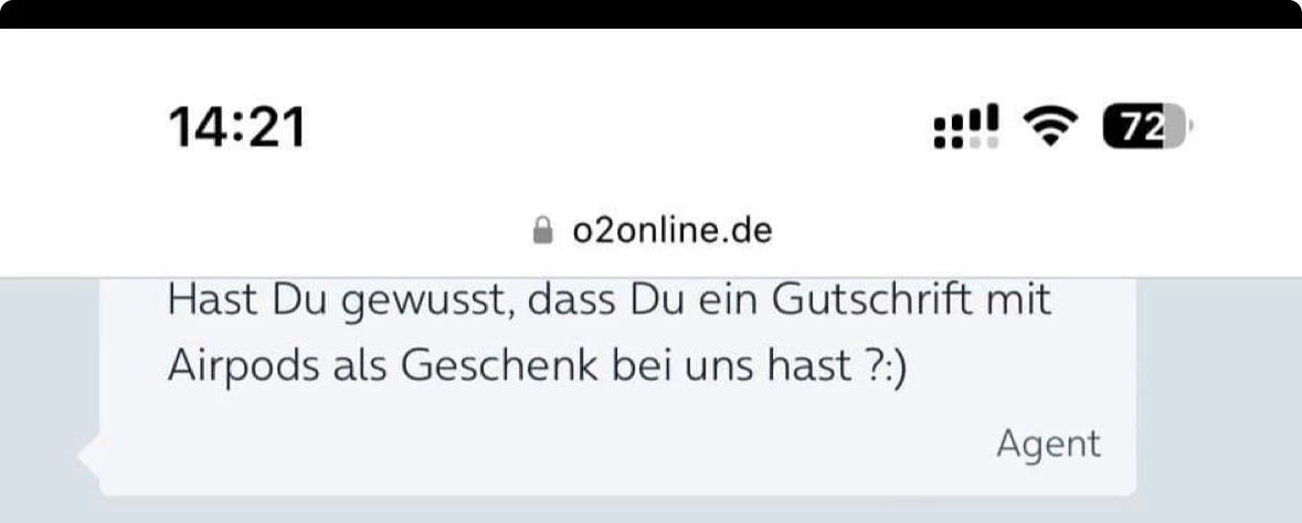 Nach dem netten Gespräch meinte die Mitarbeiterin ich hätte eine Gutschrift für Apple AirPods leider wurde der Chat beendet warum auch immer.