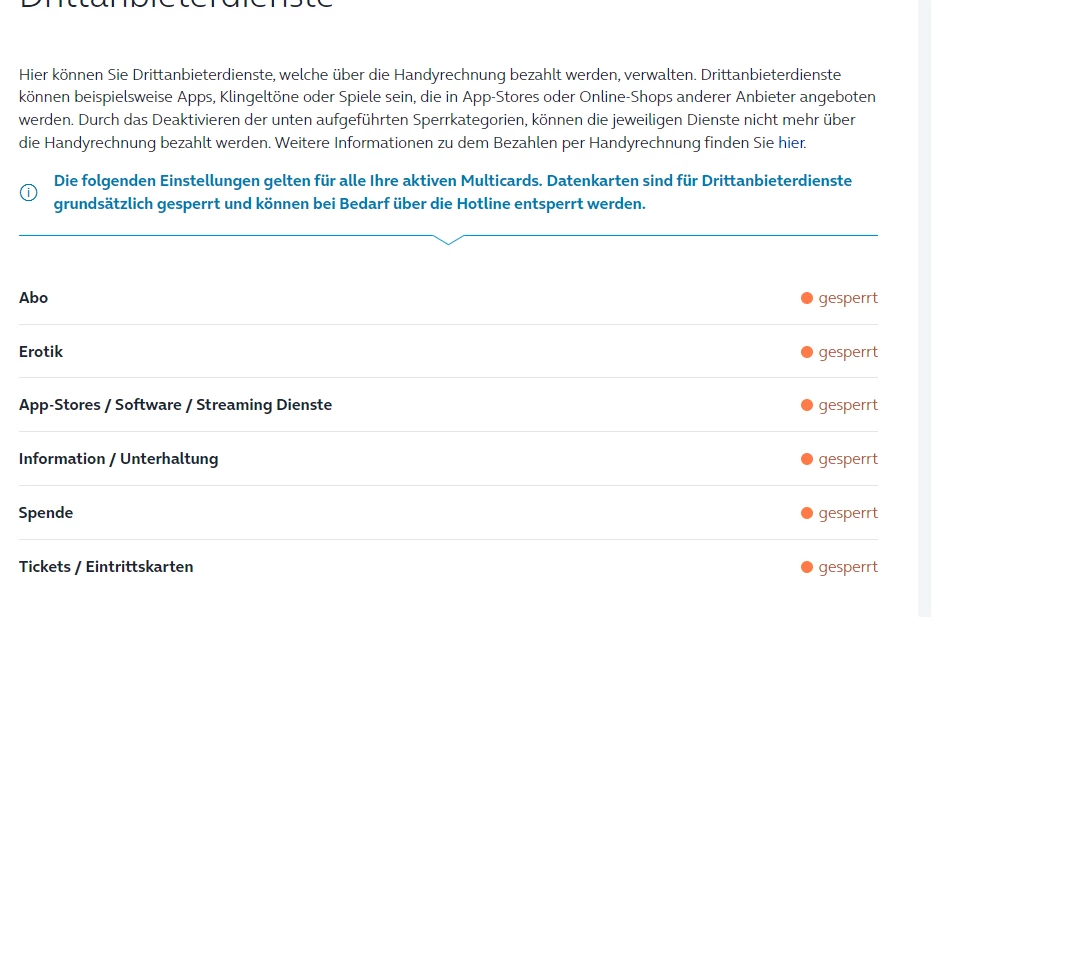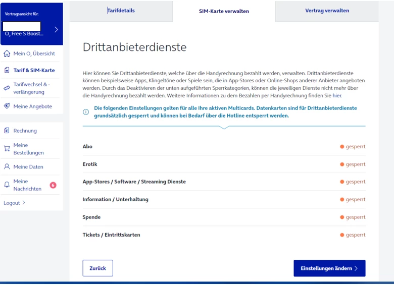 Melde dich mit der Nummer in Mein o2, die das Abo hat und schau dann mal nach, was gesperrt ist.