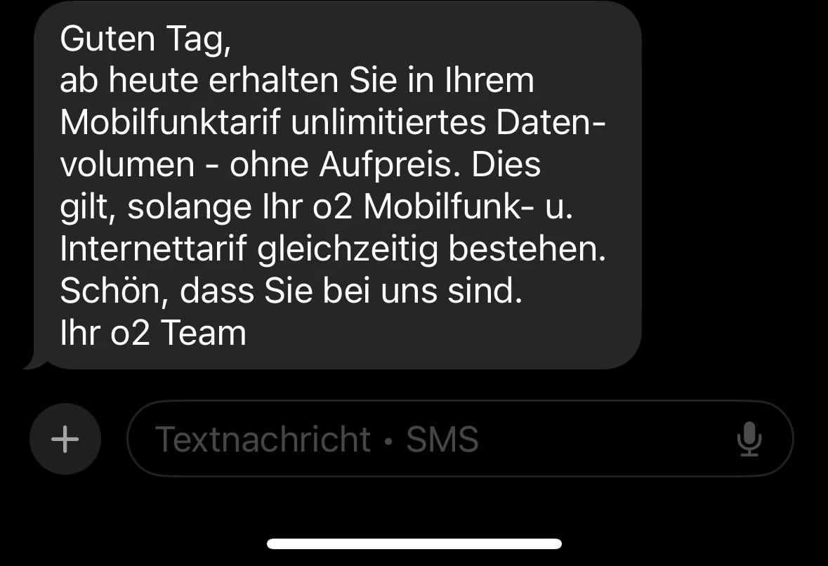 Hi, ich habe am Samstag meinen Vertrag verlängert. Ich bin vom O2 Unlimited Smart auf das O2 Mobile L gewechselt. Nun habe ich die im Anhang befindliche SMS erhalten. Habe ich wieder unbegrenzt Datenvolumen? In der Mein O2 App wird weiterhin nur 100Gb Datenvolumen angezeigt deswegen bin ich verwirrt. SMS kommt definitiv von O2