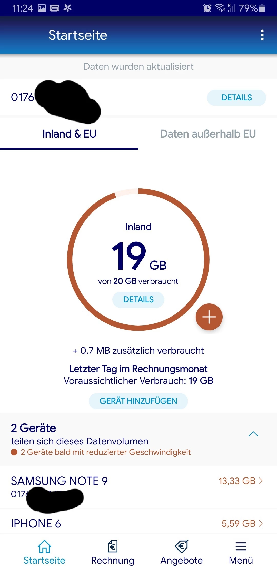 Ich habe soeben eine SMS vekommen, mein Highspeed Datenvolumen sei verbraucht. Die O2 App aufgemacht aktualisiert und 19 von 20 GB genutzt. Nochmal aktualisiert, unverändert.