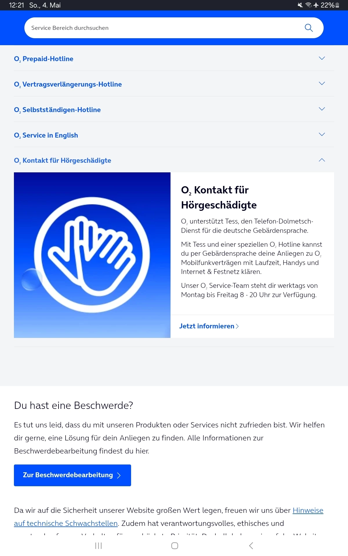 nachdem ich mich jetzt durch das Portal ‘gewuselt’ habe und festgestellt habe, dass ich mich bei ‘Mein O2’ nicht einlocken kann (trotz das ich alle Zugangsdaten in einem Passwortmanager gespeichert habe) Finde ich keine Barrierefreie Möglichkeit, meinen Vertrag zu kündigen. Ich bin ‘gehörlos’ und kann bei dieser blöden Option, ANRUFEN’ nicht in Aktion treten. *Kotz* Kann ich mal eine Mailadresse erhalten, wo ich meinen Vertrag kündigen kann. Danke