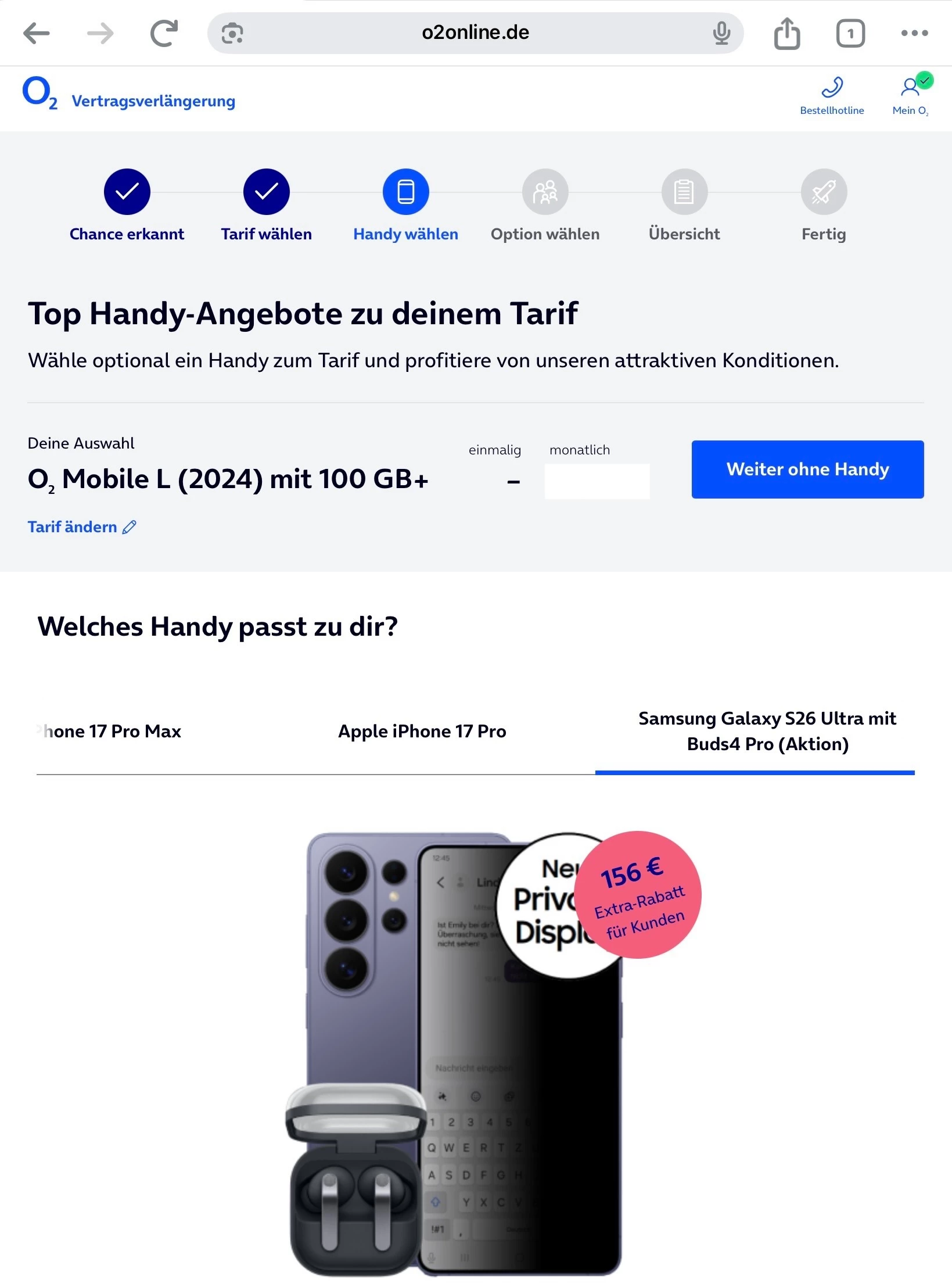 Deshalb habe ich über den Bereich ‚Angebote‘ einen neuen Tarif abgeschlossen und die Option für 79 € monatlich für 24 Monate mit dem Samsung Galaxy S26 gewählt.