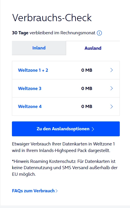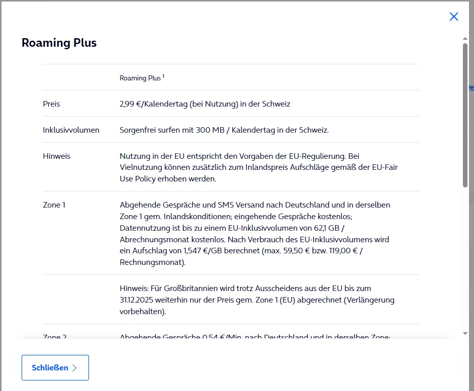 @phlfx  könntest du mal unter Ausland auf die Details klicken vom Roaming Plus Paket, dort sollte jetzt unter Zone 1 was von *Datennnutzung ist bis zu einem EU-Inklusivvolumen von 62GB / Abrechnungsmonat kostenlos. Nach Verbrauch des EU-Inklusivvolumens wird ein Aufschlag von 1,547 EUR/GB berechnet.* stehen.
