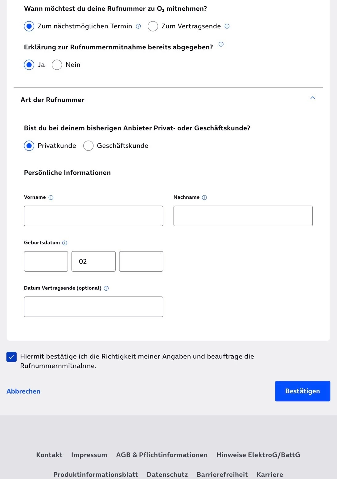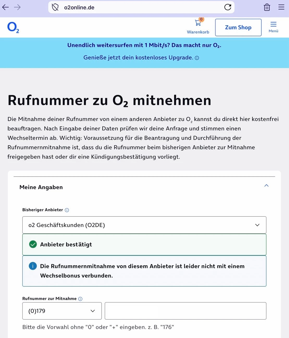 Wichtig, bei Bisheriger Anbieter musst du o2 Geschäftskunden (O2DE) auswählen.