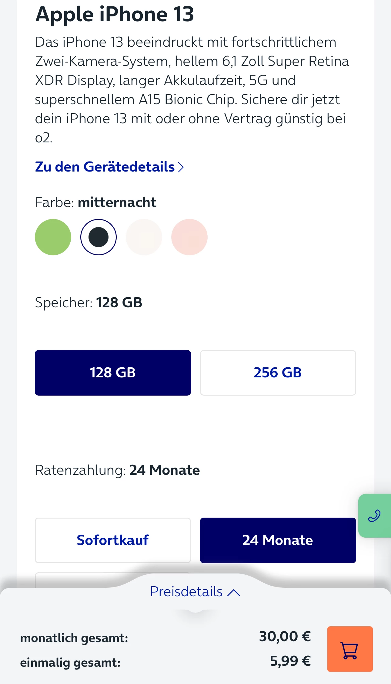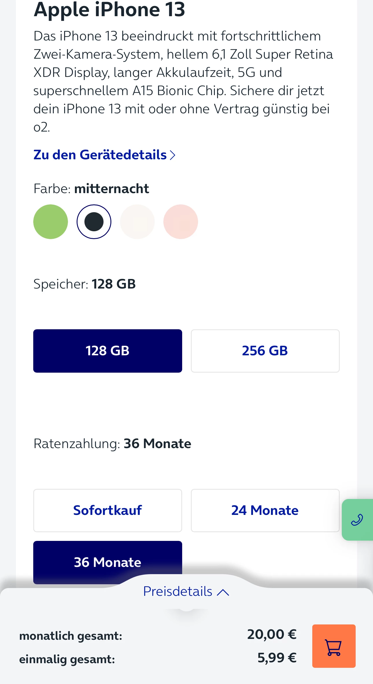 Ich möchte gerne ein iPhone 13 128Gb Mitternacht bei o2 bestellen und wollte wissen wieviel wird es mir monatlich kosten/ in Ratenzahlung ohne simkart? Nur handy...