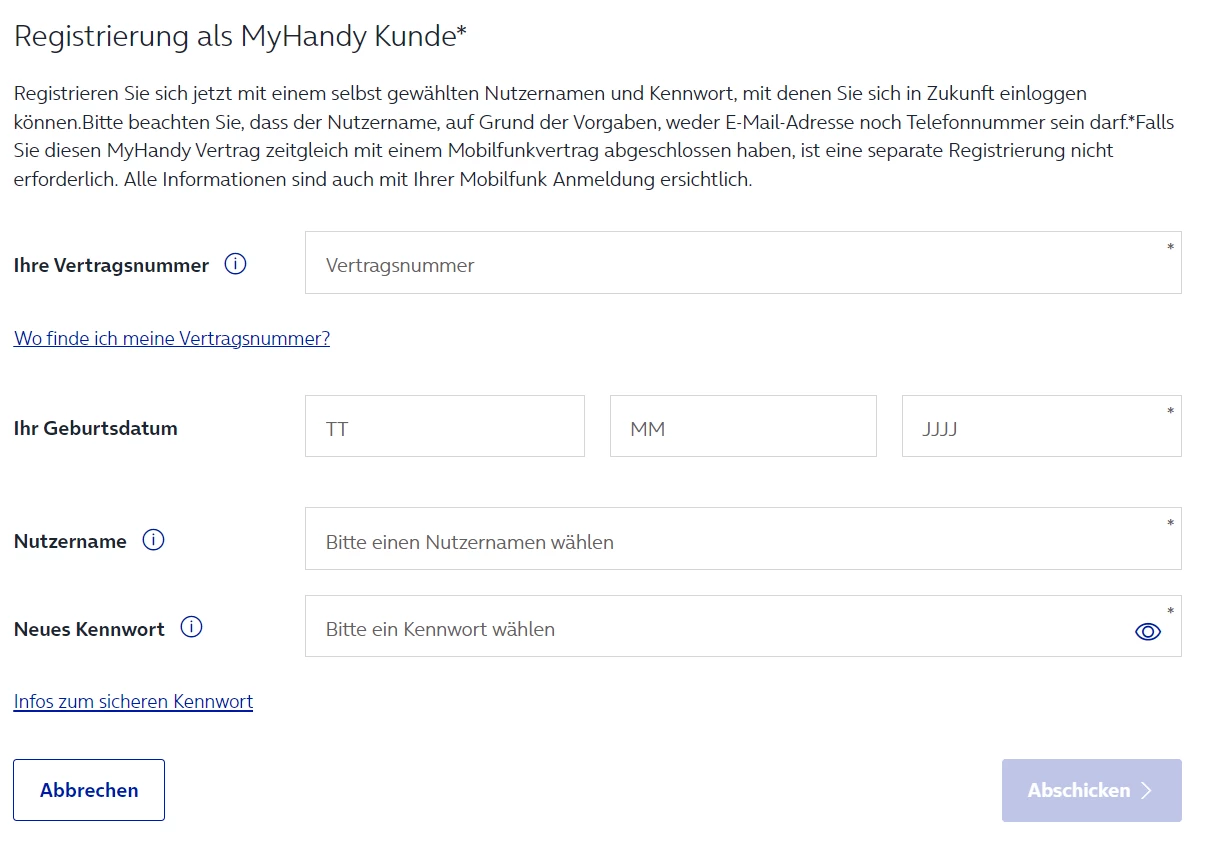 Eine neue Registrierung halte ich in dem Falle nicht für sinnvoll, da es ja bereits ein bestehendes Konto gibt unter dem ich alle MyHandy Verträge finde.