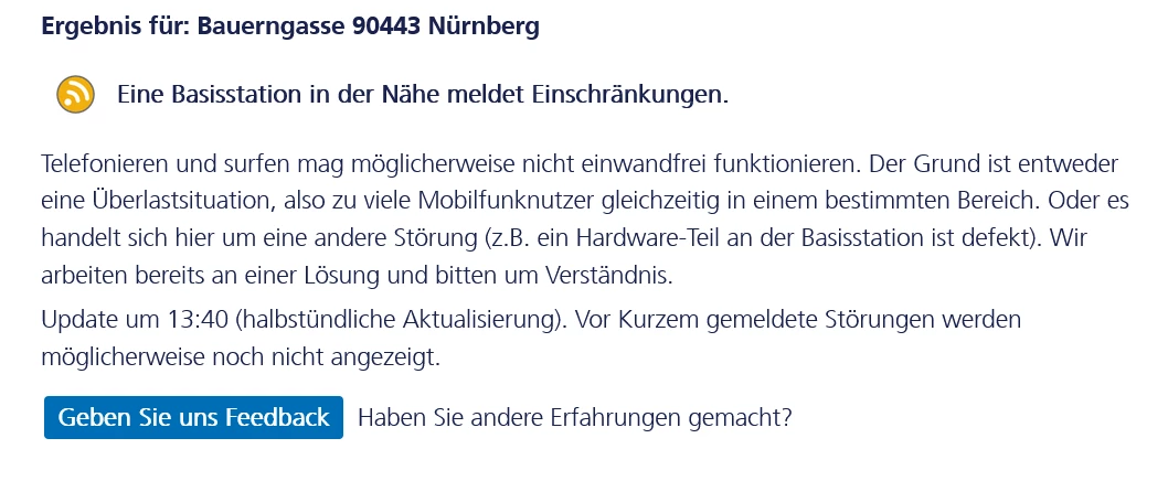 Ja, ich habe regelmäßig in den Netzcheck geschaut und es kommt immer die Meldung “Eine Basisstation in der Nähe meldet Einschränkungen.”