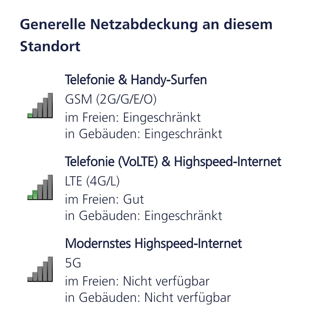 Dass "falsche" informationen bzgl Empfang abgegeben sind, ist ärgerlich. Da werden Überlastungen zb nicht angezeigt. Die "Generelle Netzabdeckung" zeigt nur, wie es sein sollte - nicht IST.