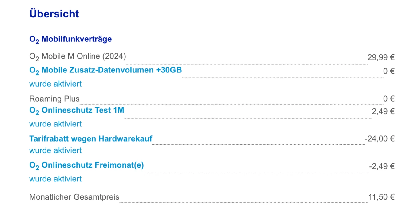 @o2_Rebecca  ​@o2_Bianca die Daten der VVL sind nun richtig hinterlegt…leider gefällt mir die Rechenfähigkeit seitens O2 gar nicht. Der Vertrag kostet 29,99€ abzüglich 24€ Rabatt wegen Hardwarekauf. Das macht bei mir 5,99€ effektiv. Bei o2 sind das 11,50€.