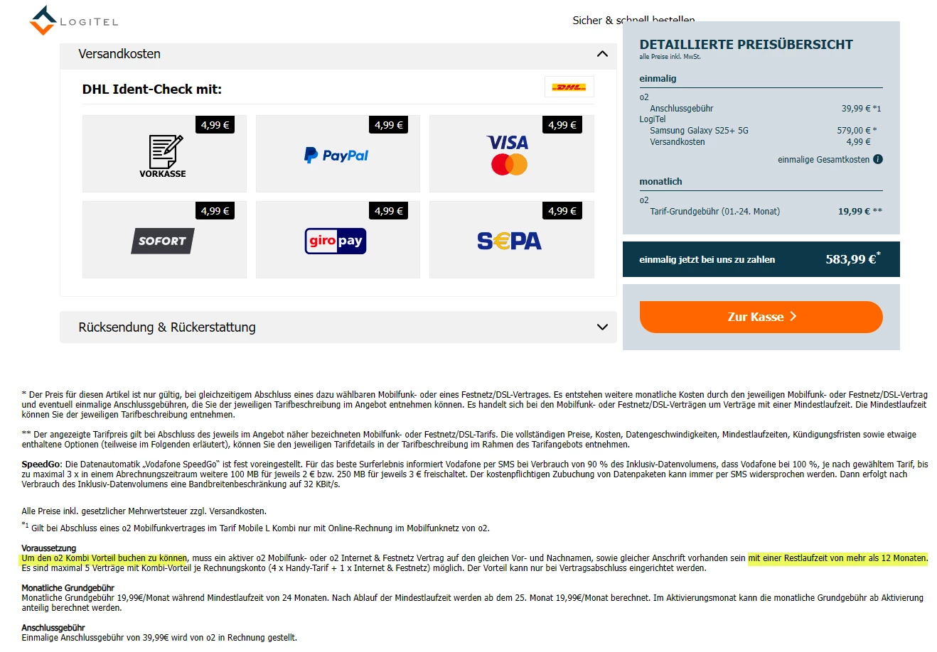 Ich möchte über logitel.de nun ein Handy mit Tarif (24 Monate Mindestlaufzeit) mit o2-Kombi-Vorteil kaufen, bin mir aber nicht sicher, ob der Kombi-Vorteil (reduzierte Monatsgebühr) hier greift oder ich eine Überrauschung erleben könnte.