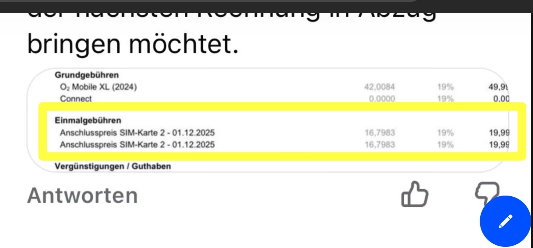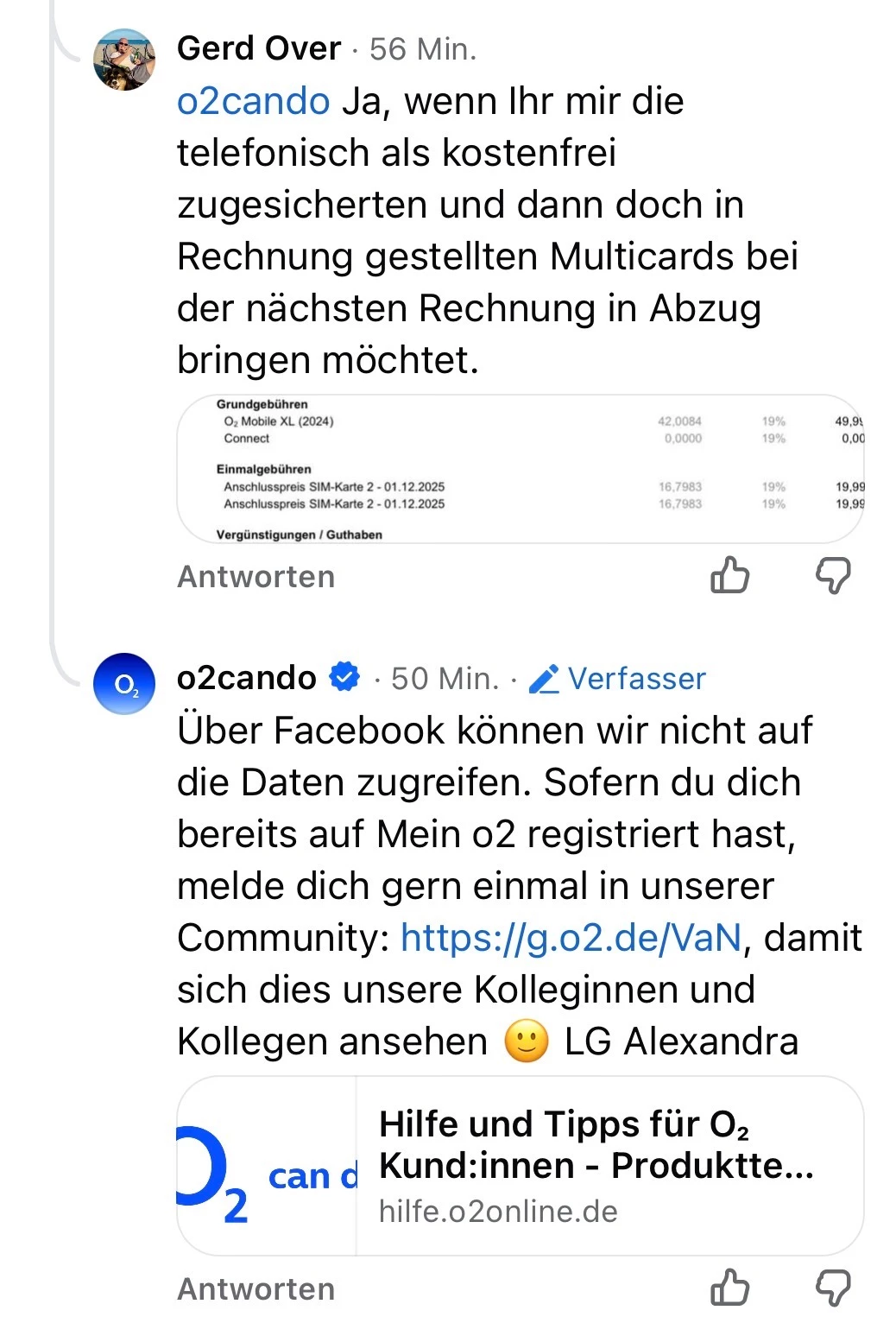 Mir wurden telefonisch 2 kostenfreie Multicards zugesichert, die auf der vorletzten Rechnung trotzdem berechnet wurden.