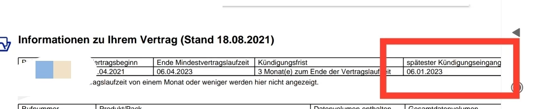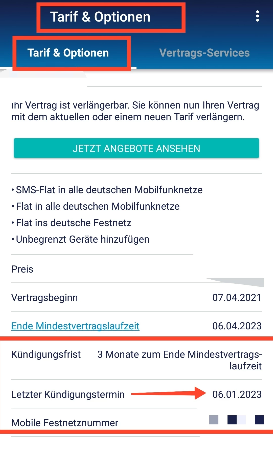 In der App und auf jeder Rechnung steht die Mindestvertraglaufzeit und wann die Kündigung spätestens eingegangen sein muss. Erfolgt die Kündigung erst nach Ende der Kündigungsfrist, verlängert sich der Vertrag automatisch um 12 weitere Monate.