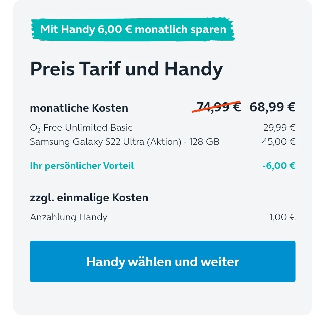 Also ich finde es gerade ein wenig unverschämt. Auf der Internetseite  steht es als Angebot für 68.99 und Sie bieten mir zu dem durchgestrichenen Vertrag an 74.99.