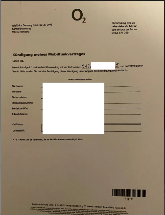 Oder du schickst es schriftlich an : Telefónica Germany GmbH & Co. OHG  90345 Nürnberg
