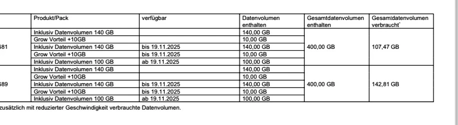 Das jeweilige inklusive Datenvolumen hat sich seit den letzten Vertragsverlängerungen geändert, deshalb steht auf der Rechnung bei dem Datenvolumen auch “bis 19.11.2025”. Ich habe nun einmal bei beiden Verträgen das Datenvolumen zurücksetzen lassen.