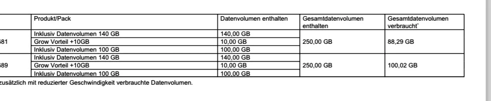 @Bumer Danke für deine Nachricht. Um das Ganze aufzuklären und die Diskrepanz zu verdeutlichen (siehe Screenshots): 1. Alte Rechnung (Stand 28.11.2025): > Hier waren offiziell sogar 400,00 GB Gesamtdatenvolumen pro Nummer ausgewiesen. Faktisch wurden mir jedoch nur 150 GB bereitgestellt. 2. Aktuelle Rechnung (Stand 30.12.2025): > In der neuen Rechnung sind nun 250,00 GB pro Nummer (140 GB + 10 GB Grow + 100 GB Inklusiv-Daten) festgeschrieben. Trotzdem stehen mir real nur 100 GB zur Verfügung, und danach wird die Verbindung komplett abgeschaltet. Wie man auf den beigefügten Ausschnitten sieht, bestätigt die Abrechnung schwarz auf weiß diese hohen GB-Zahlen. Da ich aber seit Monaten deutlich weniger erhalte, handelt es sich hier um einen massiven Systemfehler bei der Bereitstellung. Ich zahle für Leistungen, die mir technisch nicht freigeschaltet werden.
