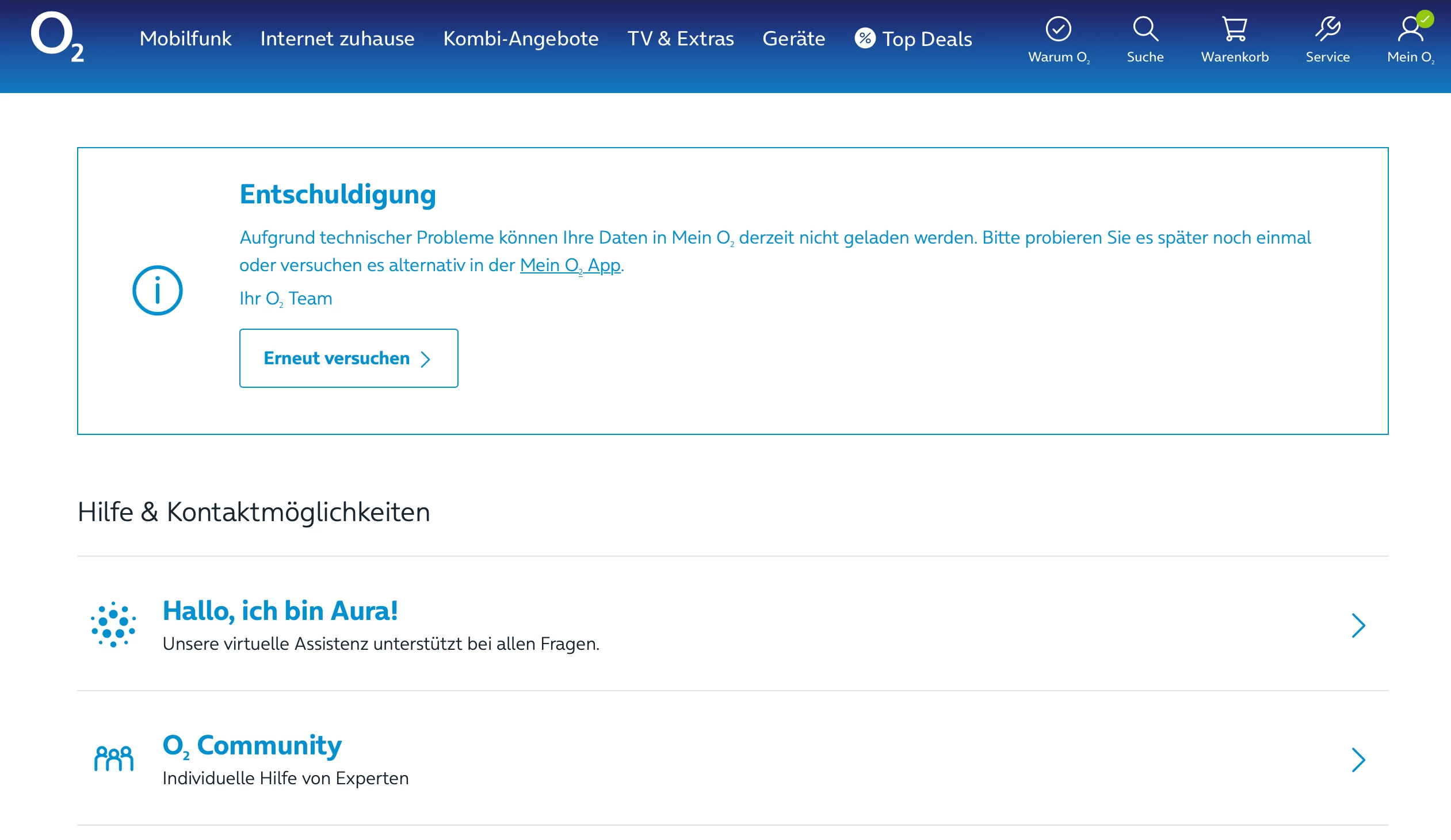Aufgrund technischer Probleme können Ihre Daten in Mein O2 derzeit nicht geladen werden. Bitte probieren Sie es später noch einmal oder versuchen es alternativ in der Mein O2 App.