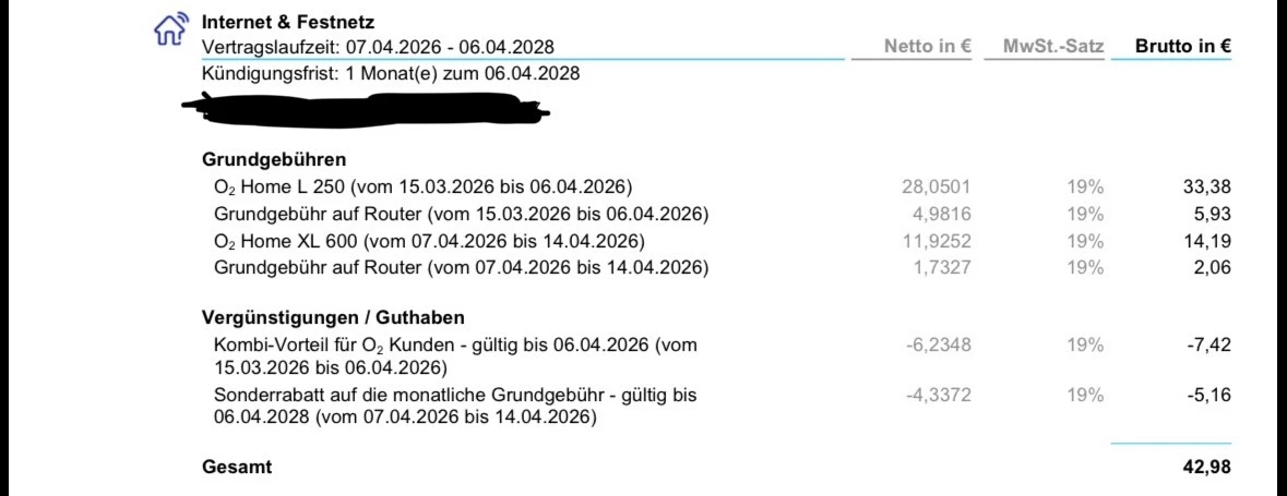 Es geht aber um die 42,98 die in der aktuellen Rechnung sind.Da wir unseren DSL Anschluss nie nutzen konnten. Dafür wurden aber von dem 15.03.2026-06.04.2026 Kosten berechnet und von dem Kabel Anschluss wurden Kosten berechnet von dem 07.04.2026-14.04.2026 der Router kam aber erst am 17.04.2026 daher konnten wir auch in diesem Zeitraum kein Internet nutzen.