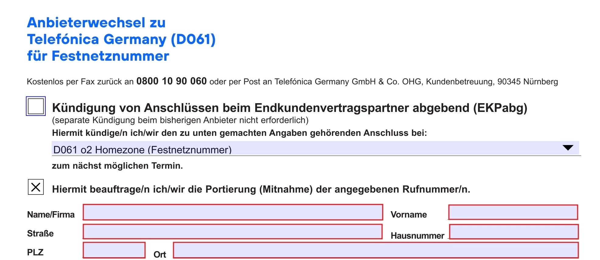 abgebender Anbiieter: D061 o2 Homezone (Festnetznummer), Haken raus bei Kündigung von Anschlüssen, beide unterschreiben, eine separate Vollmacht wird nicht benötigt.
