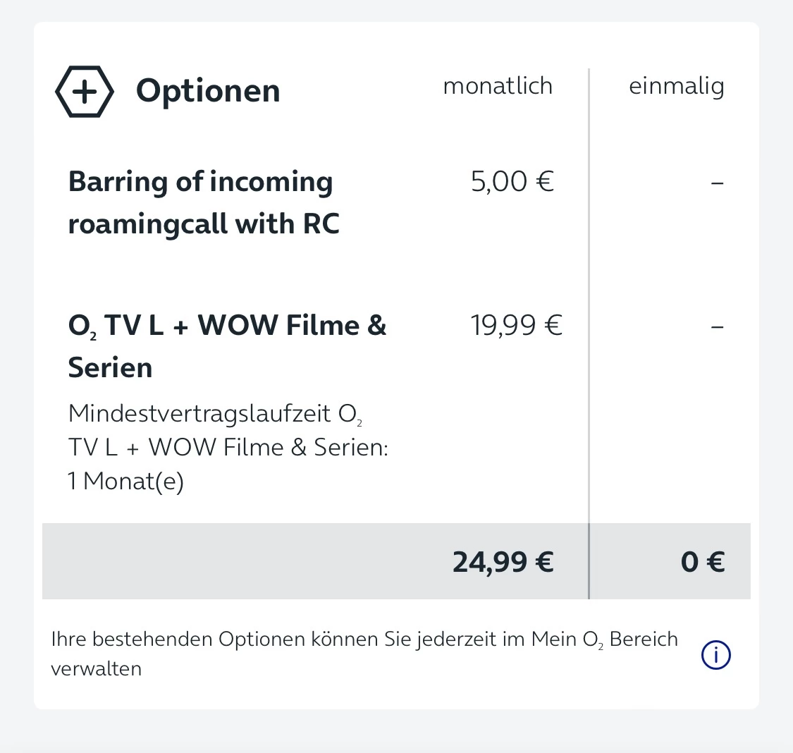 Und dann ist da noch eine Option für 5€ ausgewählt. „Barring of incoming roamingcall with RC“