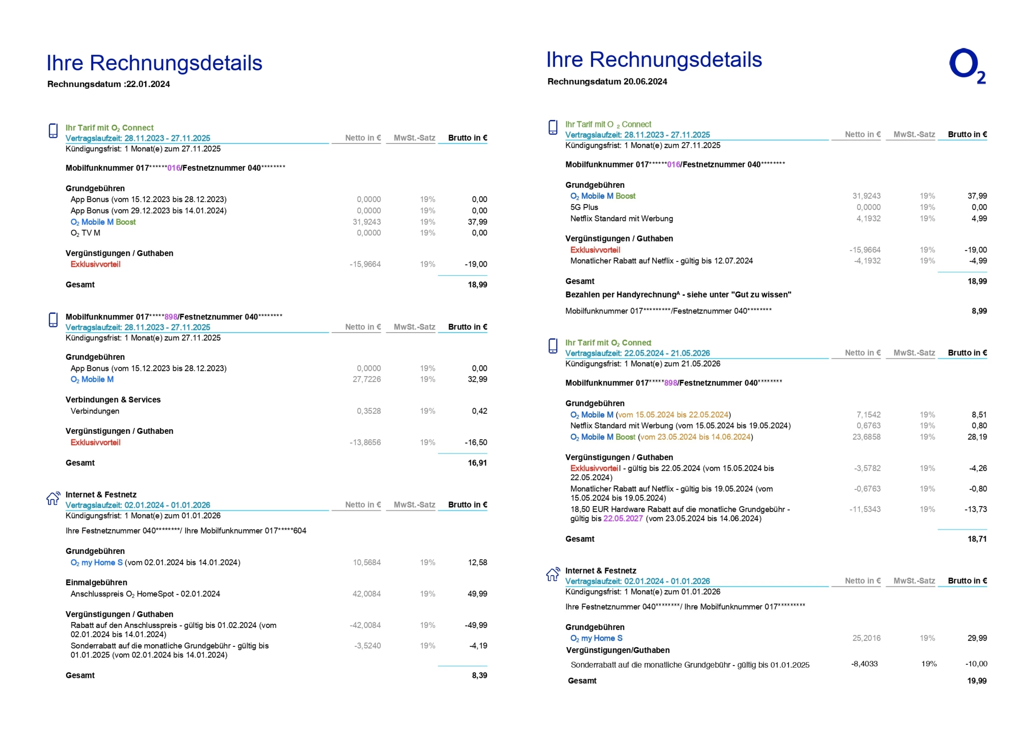 Beim 2. Mobilfunkvertrag (-898) erfolgte im Mai 2024 eine VVL mit Tarifwechsel (Mobile M auf Mobile M Boost) und Hardwarekauf, der Exklusivvorteil ging dabei flöten und ein Hardware-Rabatt (dieser läuft lt. Rechnung bis 22.5.2027) kam rein.
