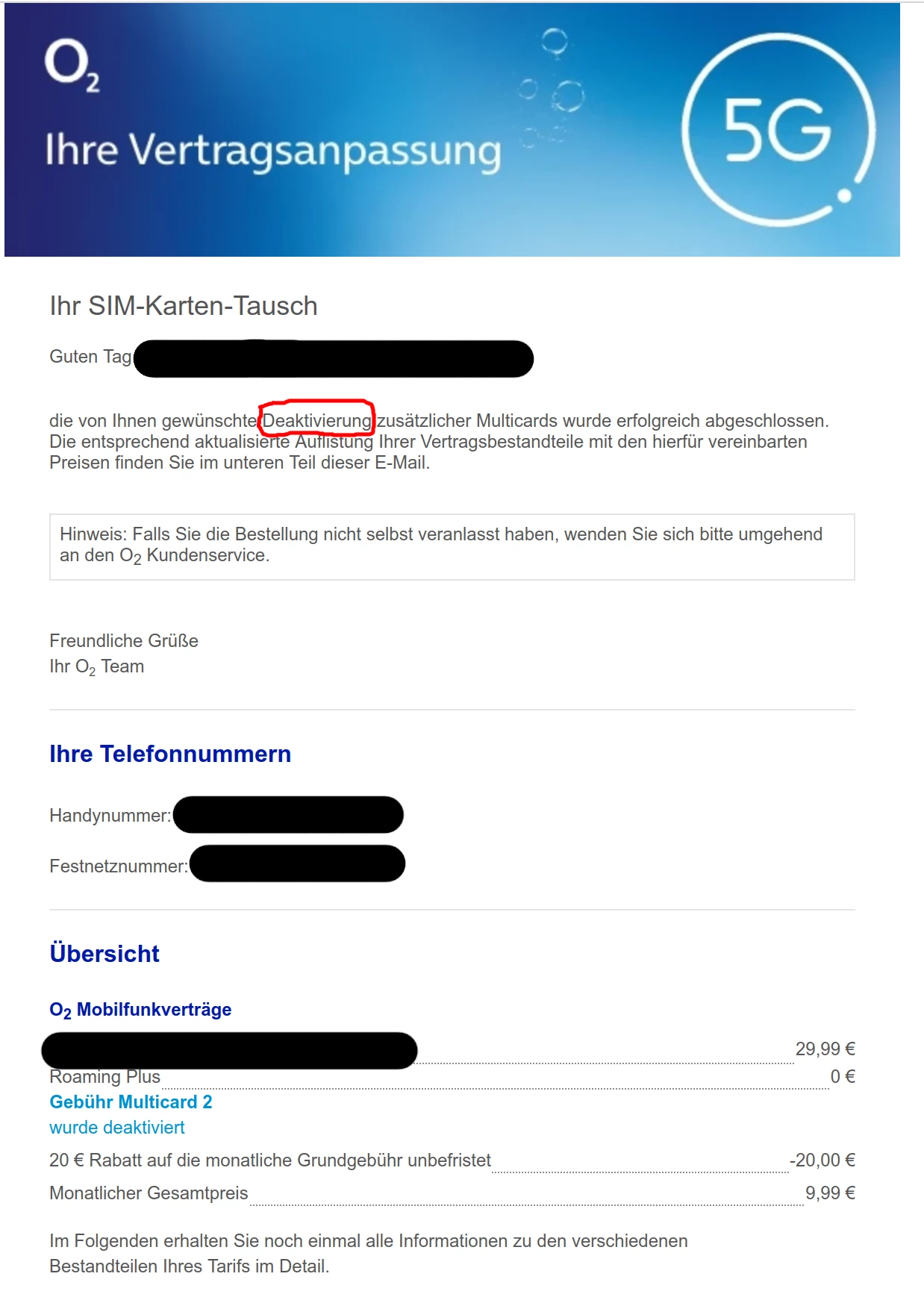 allerdings kam danach eine Mail mit “Ihr SIM-Karten-Tausch”, neuen Vertragskonditionen und einer Kostennote von 29,99€ je deaktivierter Karte.